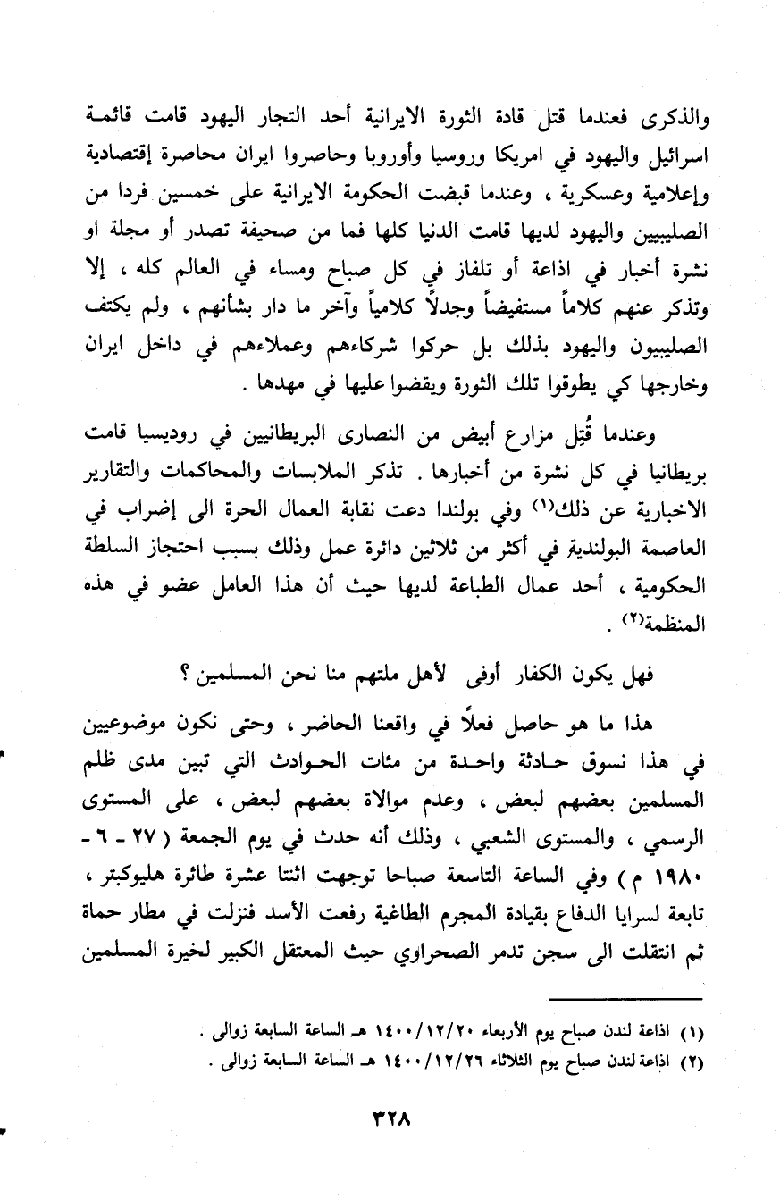 والذكرى فعندما قتل قادة الثورة الإيرانية أحد التجار اليهود قامت قائمة إسرائيل واليهود في أمريكا وروسيا وأوروبا وحاصروا إيران محاصرة اقتصادية وإعلامية وعسكرية، وعندما قبضت الحكومة الإيرانية على خمسين فردا من الصليبيين واليهود لديها قامت الدنيا كلها فما من صحيفة تصدر أو مجلة أو نشرة أخبار في إذاعة أو تلفاز في كل صباح ومساء في العالم كله، إلا وتذكر عنهم كلاما مستفيضا وجدلا كلاميا وآخر ما دار بشأنهم ولم يكتف الصليبيون واليهود بذلك بل حركوا شركاءهم وعملاءهم في داخل إيران وخارجها كي يطوقوا تلك الثورة ويقضوا عليها في مهدها.