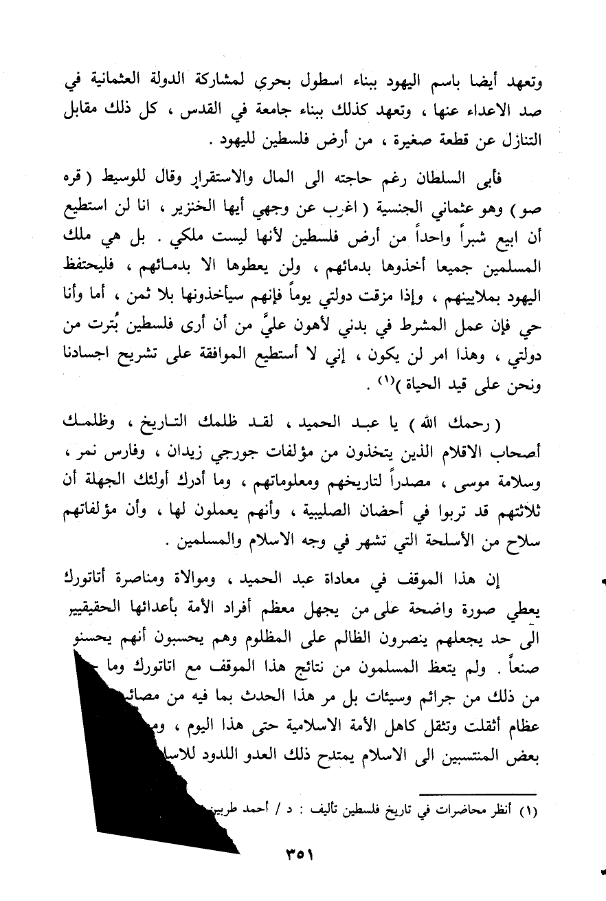 فأبي السلطان رغم حاجته إلى المال والاستقرار وقال للوسيط قره صو وهو عثماني الجنسية: اغرب عن وجهي أيها الخنزير، أنا لن أستطيع أن أبيع شبرا واحدا من أرض فلسطين لأنها ليست ملكي، بل هي ملك المسلمين جميعا أخذوها بدمائهم، ولن يعطوها إلا بدمائهم، فليحتفظ اليهود بملايينهم وإذا مزقت دولتي يوما فإنهم سيأخذونها بلا ثمن أما وأنا حي فإن عمل المشرط في بدني لأهون علي من أن أرى فلسطين بترت من دولتي وهذا أمر لن يكون، إني لا أستطيع الموافقة على تشريح أجسادنا ونحن على قيد الحياة (¬1).