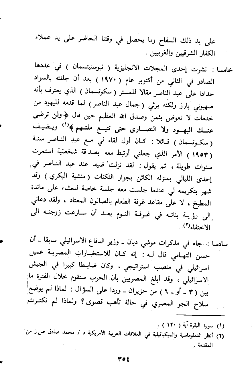 خامسًا: نشرت إحدى المجلات الإنجليزية نيوستيتسمان في عددها الصادر في الثاني من أكتوبر عام (1970) بعد أن جللته بالسواد حدادا على عبد الناصر مقالا للمستر سكوتسمان الذي يعترف بأنه صهيوني بارز ولكنه يرثي جمال عبد الناصر، لما قدمه لليهود من خدمات لا تعوض بثمن وصدق الله العظيم حين قال: (وَلَنْ تَرْضَى عَنْكَ الْيَهُودُ وَلا النَّصَارَى حَتَّى تَتَّبِعَ مِلَّتَهُمْ) [البقرة: 120] ويضيف سكوتسمان قائلا: كان أول لقاء لي مع عبد الناصر سنة (1953) الأمر الذي جعلني أرتبط معه بصداقة شخصية استمرت سنوات طويلة، ثم يقول: لقد نزلت ضيفًا عند عبد الناصر في إحدى الليالي بمنزله الكائن بجوار الثكنات منشية البكري وقد شهر بتكريمه لي عندما جلست معه جلسة خاصة للعشاء على مائدة المطبخ، لا على مقاعد غرفة الطعام بالصالون المعتاد ولقد دعاني إلى رؤية بناته في غرفة النوم بعد أن سارعت زوجته إلى الاختفاء (¬1).