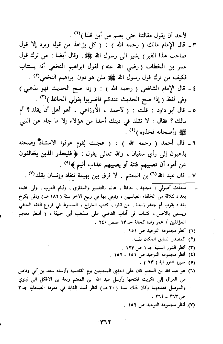 6 - قال أحمد رحمه الله: عجبت لقوم عرفوا الأستاذ وصحته يذهبون إلى رأي سفيان، والله تعالى يقول: (فَلْيَحْذَرِ الَّذِينَ يُخَالِفُونَ عَنْ أَمْرِهِ أَنْ تُصِيبَهُمْ فِتْنَةٌ أَوْ يُصِيبَهُمْ عَذَابٌ أَلِيمٌ) [النور: 63].
