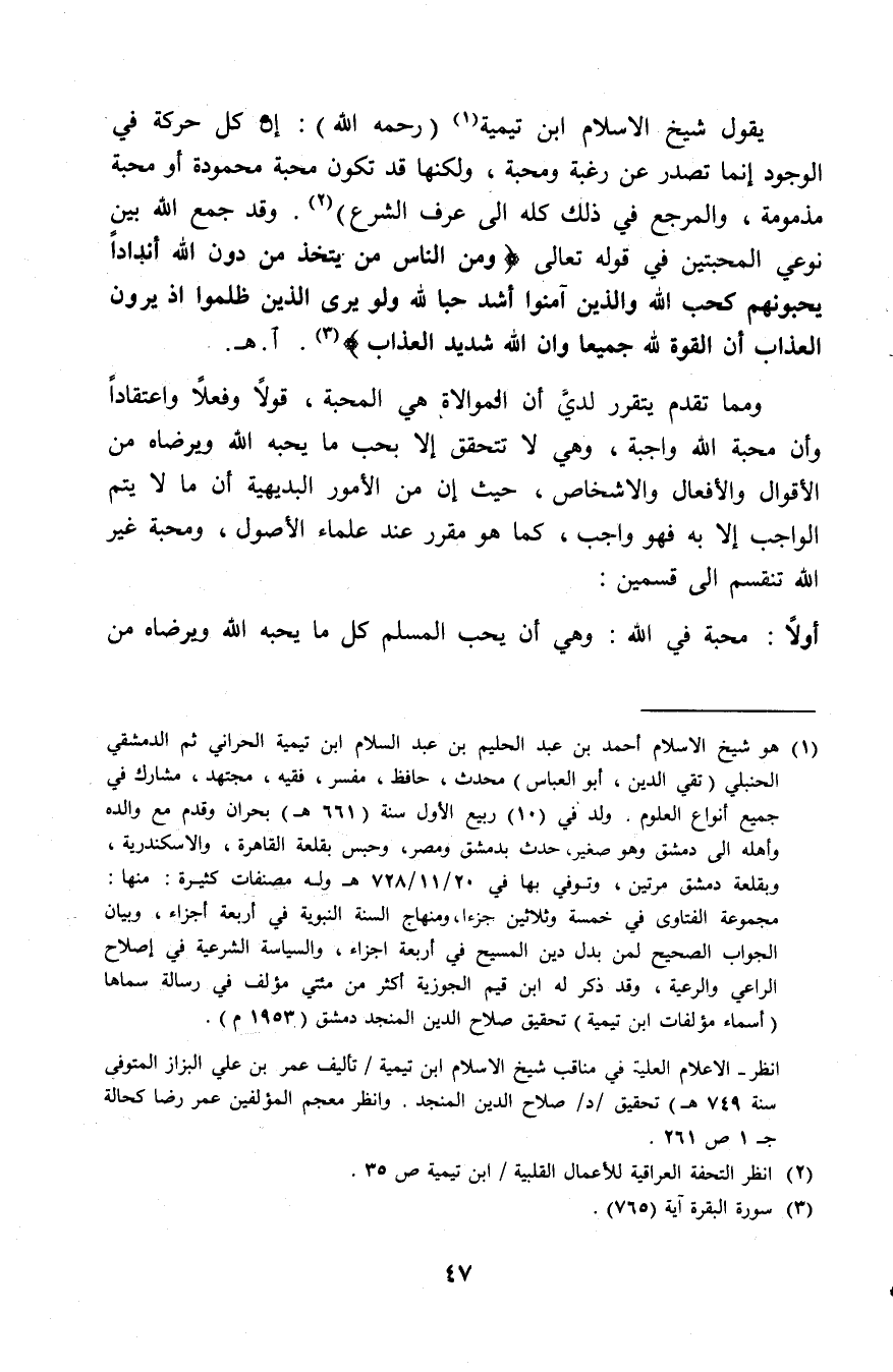 يقول شيخ الإسلام ابن تيمية (¬1) (رحمه الله) إن كل حركة في الوجود إنما تصدر عن رغبة ومحبة، ولكنها قد تكون محبة محمودة أو محبة مذمومة، والمرجع في ذلك كله إلى عرف الشرع (¬2)، وقد جمع الله بين نوعي المجتبين في قوله تعالى: (وَمِنَ النَّاسِ مَنْ يَتَّخِذُ مِنْ دُونِ اللهِ أَنْدَادًا يُحِبُّونَهُمْ كَحُبِّ اللهِ وَالَّذِينَ آمَنُوا أَشَدُّ حُبًّا للهِ وَلَوْ يَرَى الَّذِينَ ظَلَمُوا إِذْ يَرَوْنَ الْعَذَابَ أَنَّ الْقُوَّةَ للهِ جَمِيعًا وَأَنَّ اللهَ شَدِيدُ الْعَذَابِ) [البقرة: 165] اهـ.