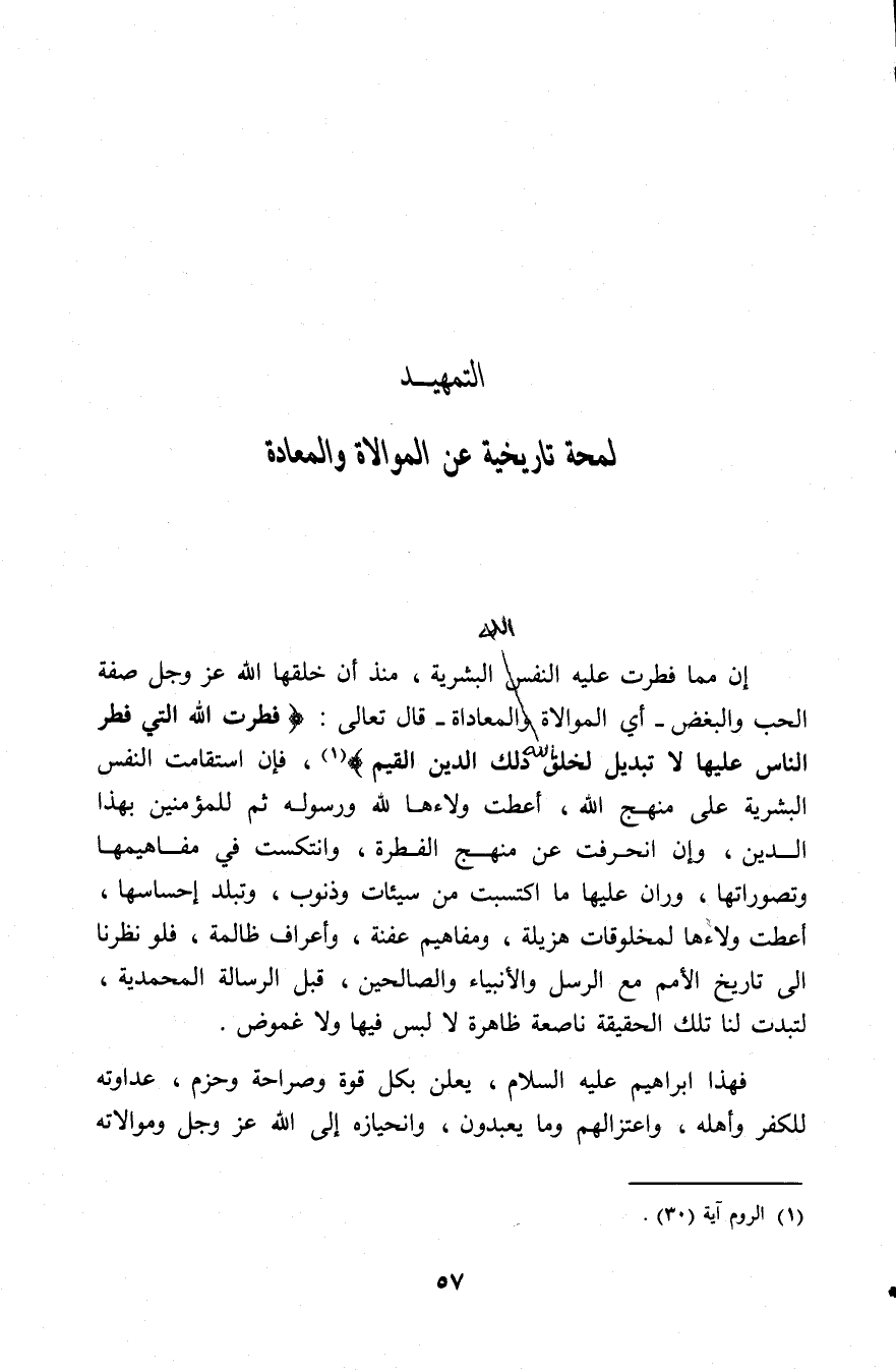 إن مما فطرت عليه النفس البشرية، منذ أن خلقها الله عز وجل صفة الحب والبغض أي الموالاة والمعاداة قال تعالى: (فِطْرَةَ اللهِ الَّتِي فَطَرَ النَّاسَ عَلَيْهَا لا تَبْدِيلَ لِخَلْقِ اللهِ ذَلِكَ الدِّينُ الْقَيِّمُ) [الروم: 30] فإن استقامت النفس البشرية على منهج الله، أعطت ولاءها لله ورسوله ثم للمؤمنين بهذا الدين، وإن انحرفت على منهج الفطرة، وانتكست في مفاهيمها وتصوراتها، وران عليها ما اكتسبت من سيئات وذنوب، وتبلد إحساسها، أعطت ولاءها لمخلوقات هزيلة، ومفاهيم عفنة، وأعراف ظالمة، فلو نظرنا إلى تاريخ الأمم مع الرسل والأنبياء والصالحين، قبل الرسالة المحمدية، لتبدت لنا تلك الحقيقة ناصحة ظاهرة لا لبس فيها ولا غموض.