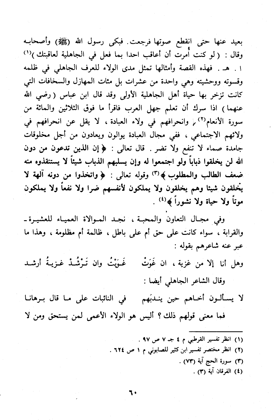 بعيد عنها حتى انقطع صوتها فرجعت فبكى رسول الله - صلى الله عليه وسلم - وأصحابه وقال: «لو كنت أمرت أن أعاقب أحدا بما فعل في الجاهلية لعاقبتك» (¬1). اهـ. فهذه القصة وأمثالها تمثل مدى الولاء للعرف الجاهلي في ظلمه وقسوته ووحشيته وهي واحدة من عشرات بل مئات المهازل والسخافات التي كانت تزجر بها حياة أهل الجاهلية الأولى وقد قال ابن عباس رضي الله عنهما: إذا سرك أن تعلم جهل العرب فاقرأ ما فوق الثلاثين والمائة من سورة الأنعام (¬2) وانحرافهم في ولاء العبادة، لا يقل عن انحرافهم في ولائهم الاجتماعي ففي مجال العبادة يوالون ويعادون من أجل مخلوقات جامدة صماء لا تنفع ولا تضر قال تعالى: (إِنَّ الَّذِينَ تَدْعُونَ مِنْ دُونِ اللهِ لَنْ يَخْلُقُوا ذُبَابًا وَلَوِ اجْتَمَعُوا لَهُ وَإِنْ يَسْلُبْهُمُ الذُّبَابُ شَيْئًا لا يَسْتَنْقِذُوهُ مِنْهُ ضَعُفَ الطَّالِبُ وَالْمَطْلُوبُ) [الحج: 73] وقوله تعالى: (وَاتَّخَذُوا مِنْ دُونِهِ آلِهَةً لا يَخْلُقُونَ شَيْئًا وَهُمْ يُخْلَقُونَ وَلا يَمْلِكُونَ لأَنْفُسِهِمْ ضَرًّا وَلا نَفْعًا وَلا يَمْلِكُونَ مَوْتًا وَلا حَيَاةً وَلا نُشُورًا) [الفرقان: 3].