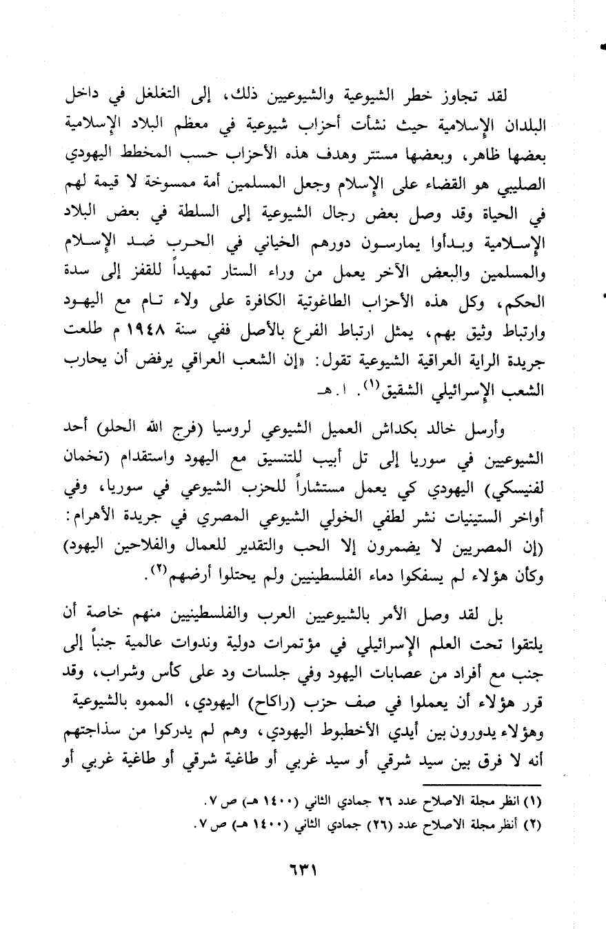 لقد تجاوز خطر الشيوعية والشيوعيين ذلك، إلى التغلغل في داخل البلدان الإسلامية حيث نشأت أحزاب شيوعية في معظم البلاد الإسلامية بعضها ظاهر، وبعضها مستتر وهدف هذه الأحزاب حسب المخطط اليهودي الصليبي هو القضاء على الإسلام وجعل المسلمين أمة ممسوخة لا قيمة لهم في الحياة وقد وصل بعض رجال الشيوعية إلى السلطة في بعض البلاد الإسلامية وبدأوا يمارسون دورهم الخياني في الحرب ضد الإسلام والمسلمين والبعض الآخر يعمل من وراء الستار تمهيدًا للقفز إلى سدة الحكم، وكل هذه الأحزاب الطاغوتية الكافرة على ولاء تام مع اليهود وارتباط وثيق بهم، يمثل ارتباط الفرع بالأصل ففي سنة 1948م طلعت جريدة الراية العراقية الشيوعية تقول: «إن الشعب العراقي يرفض أن يحارب الشعب الإسرائيلي الشقيق» (¬1). اهـ.