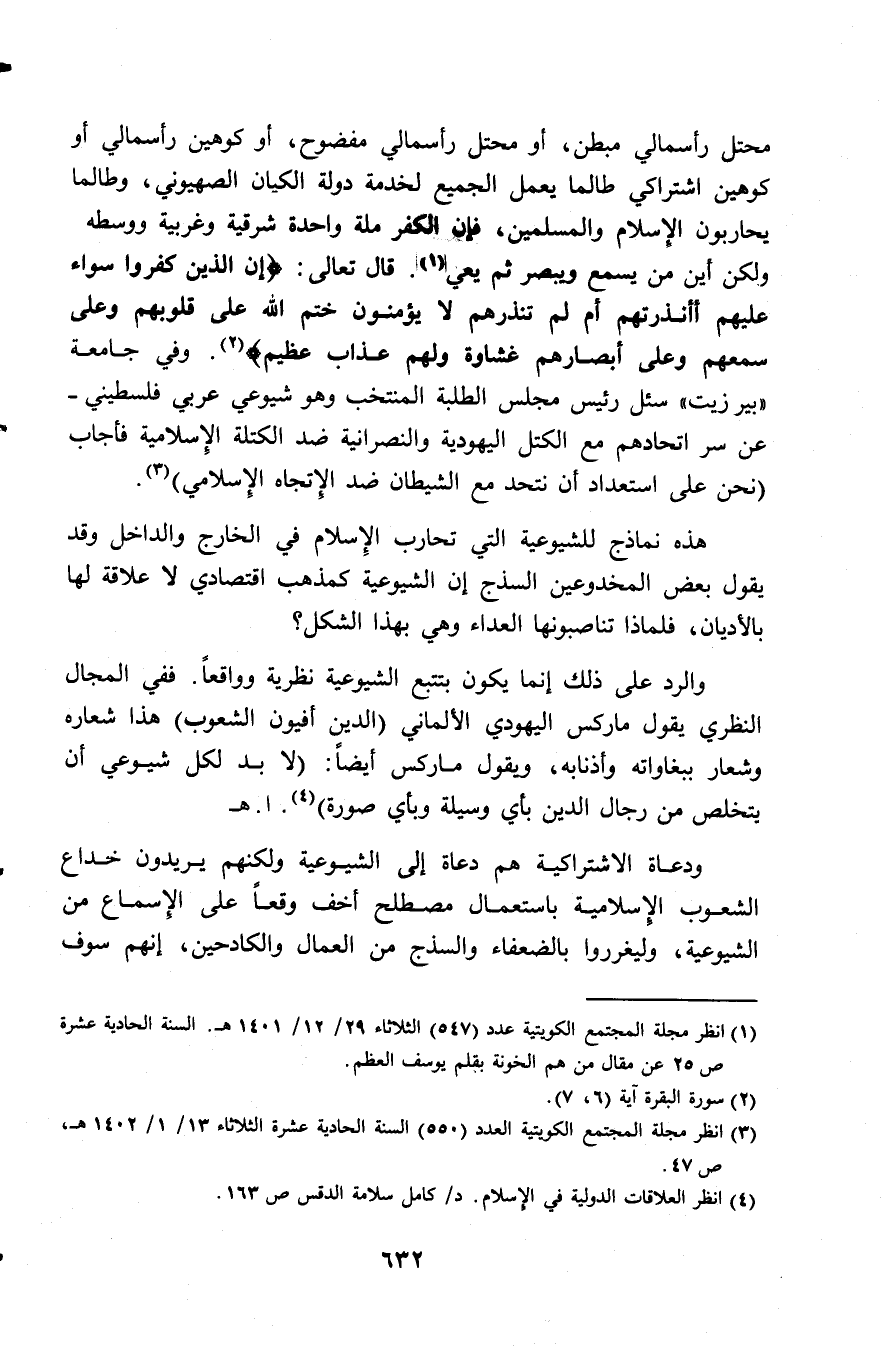 محتل رأسمالي مبطن، أو محتل رأسمالي مفضوح، أو كوهين رأسمالي أو كوهين اشتراكي طالما يعمل الجميع لخدمة دولة الكيان الصهيوني، وطالما يحاربون الإسلام والمسلمين، فإن الكفر ملة واحدة شرقية وغربية ووسطى ولكن أين من يسمع ويبصر ثم يعي (¬1). قال تعالى: (إِنَّ الَّذِينَ كَفَرُوا سَوَاءٌ عَلَيْهِمْ أَأَنْذَرْتَهُمْ أَمْ لَمْ تُنْذِرْهُمْ لَا يُؤْمِنُونَ * خَتَمَ اللَّهُ عَلَى قُلُوبِهِمْ وَعَلَى سَمْعِهِمْ وَعَلَى أَبْصَارِهِمْ غِشَاوَةٌ وَلَهُمْ عَذَابٌ عَظِيمٌ) (¬2). وفي جامعة "بيرزيت" سئل رئيس مجلس الطلبة المنتخب وهو شيوعي عربي فلسطيني - عن سر اتحادهم مع الكتل اليهودية والنصرانية ضد الكتلة الإسلامية فأجاب: «نحن على استعداد أن نتحد مع الشيطان ضد الاتجاه الإسلامي» (¬3).
