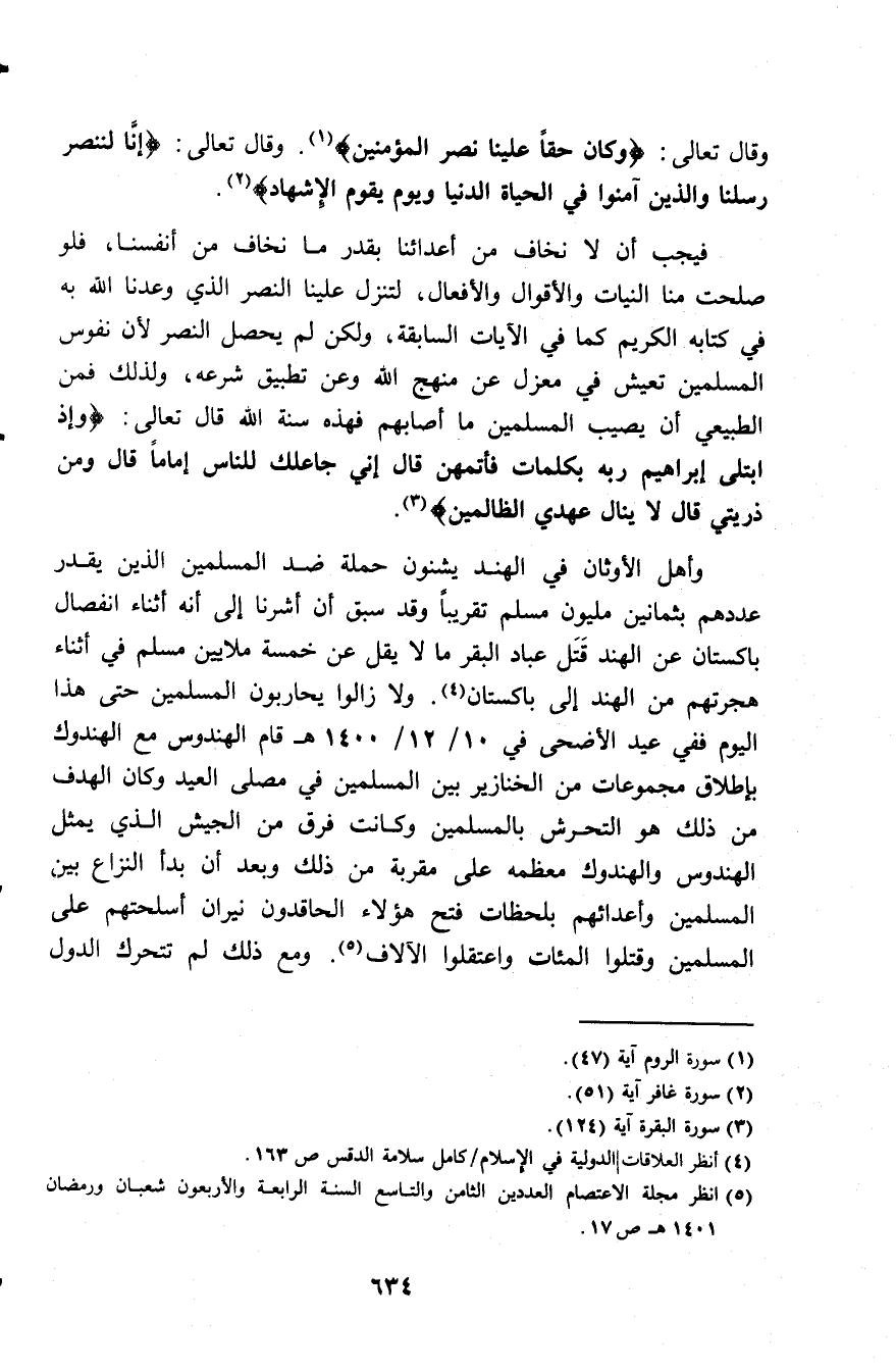 وأهل الأوثان في الهند يشنون حملة ضد المسلمين الذين يقدر عددهم بثمانين مليون مسلم تقريبًا وقد سبق أن أشرنا إلى أنه أثناء انفصال باكستان عن الهند قَتَل عباد البقر ما لا يقل عن خمسة ملايين مسلم في أثناء هجرتهم من الهند إلى باكستان (¬4). ولا زالوا يحاربون المسلمين حتى هذا اليوم ففي عيد الأضحى في 10/ 12/1400هـ قام الهندوس مع الهندوك بإطلاق مجموعات من الخنازير بين المسلمين في مصلى العيد وكان الهدف من ذلك هو التحرش بالمسلمين وكانت فرق من الجيش الذي يمثل الهندوس والهندوك معظمه على مقربة من ذلك وبعد أن بدأ النزاع بين المسلمين وأعدائهم بلحظات فتح هؤلاء الحاقدون نيران أسلحتهم على المسلمين وقتلوا المئات واعتقلوا الآلاف (¬5). ومع ذلك لم تتحرك الدول