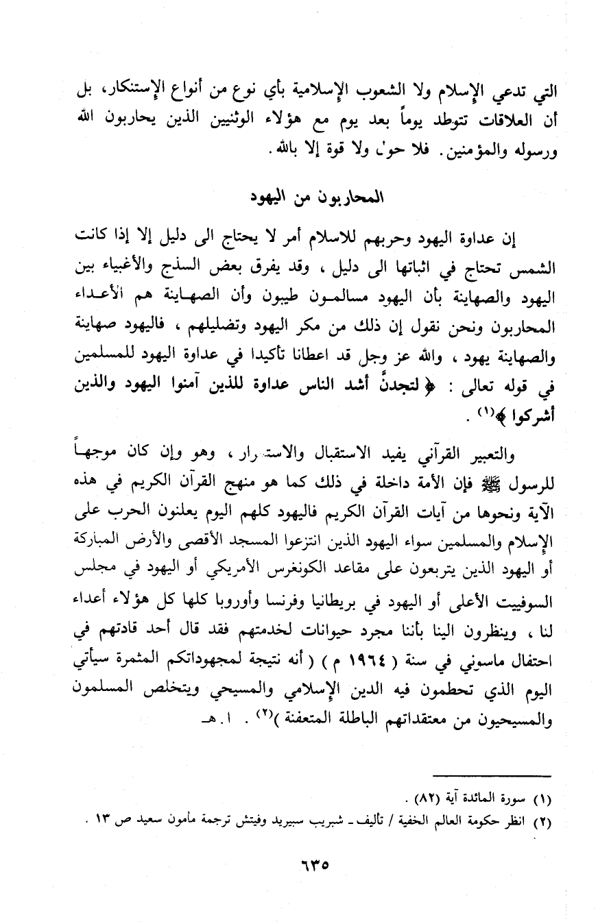 والتعبير القرآني يفيد الاستقبال والاستمرار، وهو وإن كان موجهًا للرسول - صلى الله عليه وسلم - فإن الأمة داخلة في ذلك كما هو منهج القرآن الكريم في هذه الآية ونحوها من آيات القرآن الكريم فاليهود كلهم اليوم يعلنون الحرب على الإسلام والمسلمين سواء اليهود الذين انتزعوا المسجد الأقصى والأرض المباركة أو اليهود الذين يتربعون على مقاعد الكونغرس الأمريكي أو اليهود في مجلس السوفيت الأعلى أو اليهود في بريطانيا وفرنسا وأوروبا كلها كل هؤلاء أعداء لنا، وينظرون إلينا بأننا مجرد حيوانات لخدمتهم فقد قال أحد قادتهم في احتفال ماسوني في سنة (1964م): «إنه نتيجة لمجهوداتكم المثمرة سيأتي اليوم الذي تحطمون فيه الدين الإسلامي والمسيحي ويتخلص المسلمون والمسيحيون من معتقداتهم الباطلة المتعفنة» (¬2). اهـ.