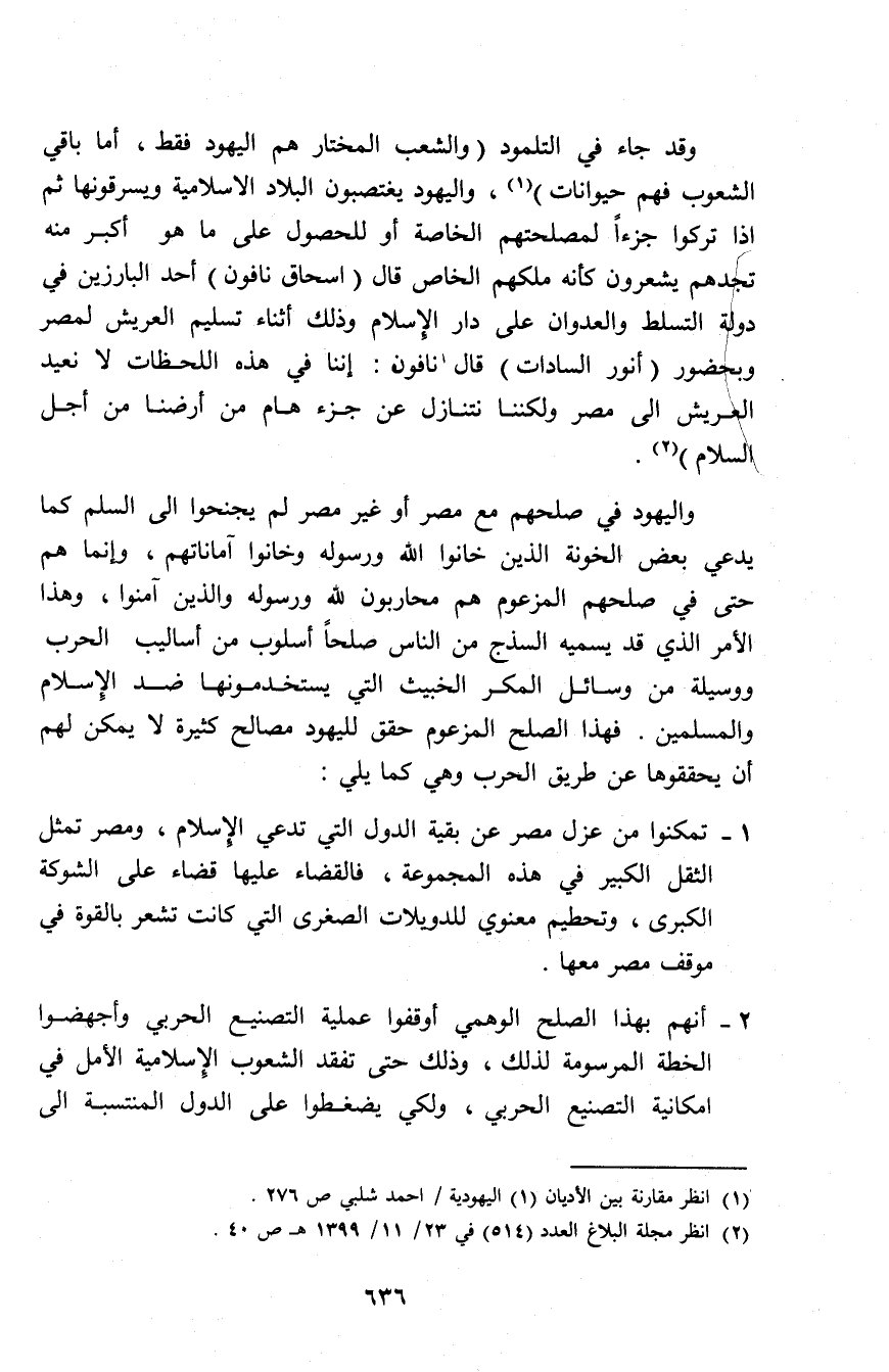 وقد جاء في التلمود «والشعب المختار هم اليهود فقط، أما باقي الشعوب فهم حيوانات» (¬1)، واليهود يغتصبون البلاد الإسلامية ويسرقونها ثم إذا تركوا جزءًا لمصلحتهم الخاصة أو للحصول على ما هو أكبر منه تجدهم يشعرون كأنه ملكهم الخاص قال (إسحاق نافون) أحد البارزين في دولة التسلط والعدوان على دار الإسلام وذلك أثناء تسليم العريش لمصر وبحضور (أنور السادات) قال نافون: «إننا في هذه اللحظات لا نعيد العريش إلى مصر ولكننا نتنازل عن جزء هام من أرضنا من أجل السلام» (¬2).
