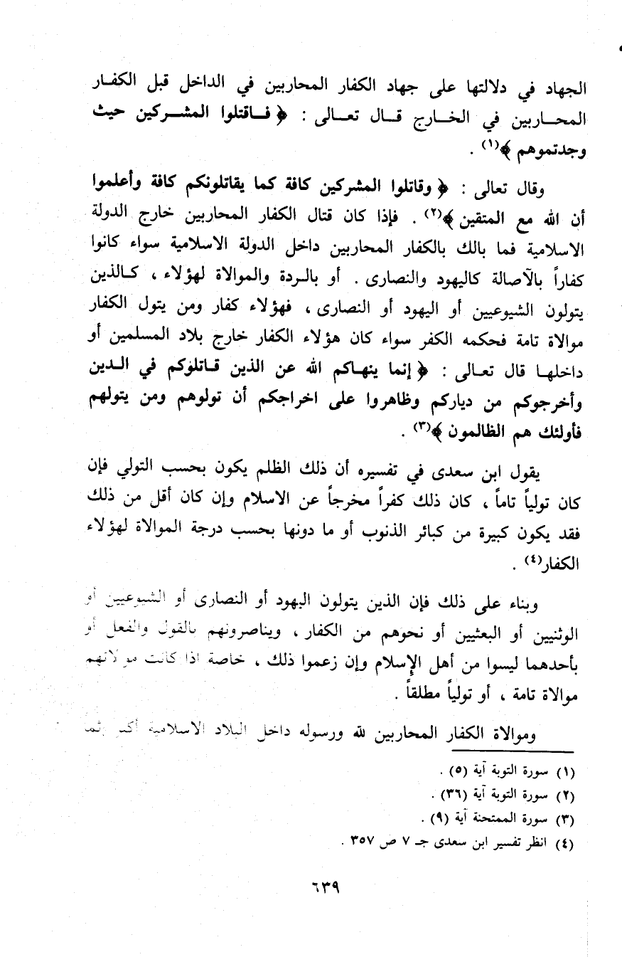 وقال تعالى: (وَقَاتِلُوا الْمُشْرِكِينَ كَافَّةً كَمَا يُقَاتِلُونَكُمْ كَافَّةً وَاعْلَمُوا أَنَّ اللَّهَ مَعَ الْمُتَّقِينَ) (¬2). فإذا كان قتال الكفار المحاربين خارج الدولة الإسلامية فما بالك بالكفار المحاربين داخل الدولة الإسلامية سواء كانوا كفارًا بالأصالة كاليهود والنصارى. أو بالردة والموالاة لهؤلاء، كالذين يتولون الشيوعيين أو اليهود أو النصارى، فهؤلاء كفار ومن يتول الكفار موالاة تامة فحكمه الكفر سواء كان هؤلاء الكفار خارج بلاد المسلمين أو داخلها قال تعالى: (إِنَّمَا يَنْهَاكُمُ اللَّهُ عَنِ الَّذِينَ قَاتَلُوكُمْ فِي الدِّينِ وَأَخْرَجُوكُمْ مِنْ دِيَارِكُمْ وَظَاهَرُوا عَلَى إِخْرَاجِكُمْ أَنْ تَوَلَّوْهُمْ وَمَنْ يَتَوَلَّهُمْ فَأُولَئِكَ هُمُ الظَّالِمُونَ) (¬3).
