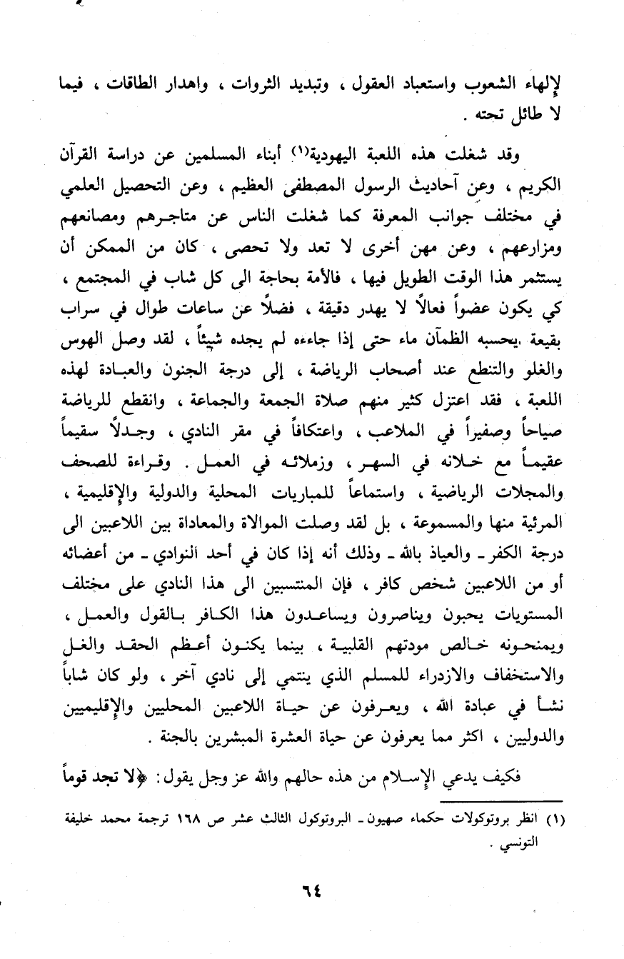 وقد شغلت هذه اللعبة اليهودية (¬1) أبناء المسلمين عن دراسة القرآن الكريم، وعن آحاديث الرسول المصطفى العظيم، وعن التحصيل العلمي في مختلف جوانب المعرفة كما شغلت الناس عن متاجرهم ومصانعهم ومزارعهم وعن مهن أخرى لا تعد ولا تحصى، كان من الممكن أن يستثمر هذا الوقت الطويل فيها، فالأمة بحاجة إلى كل شاب في المجتمع، كي يكون عضوا فعالا لا يهدر دقيقة فضلا عن ساعات طوال في سراب بقيعة يحسبه الظمآن ماء حتى إذا جاءه لم يجده شيئا، لقد وصل الهوس والغلو والتنطع عند أصحاب الرياضة، إلى درجة الجنون والعبادة لهذه اللعبة، فقد اعتزل كثير منهم صلاة الجمعة والجماعة، وانقطع للرياضة صياحا وصفيرا في الملاعب، واعتكافا في مقر النادي، وجدلا سقيما عقيما مع خلانه في السهر، وزملائه في العمل، وقراءة للصحف والمجلات الرياضية، واستماعا للمباريات المحلية والدولية والإقليمية المرئية منها والمسموعة، بل لقد وصلت الموالاة والمعاداة بين اللاعبين إلى درجة الكفر والعياذ بالله وذلك أنه إذا كان في أحد النوادي من أعضائه أو من اللاعبين شخص كافر، فإن المنتسبين إلى هذا النادي على مختلف المستويات يحبون ويناصرون ويساعدون هذا الكافر بالقول والعمل، ويمنحونه خالص مودتهم القلبية، بينما يكنون أعظم الحقد والغل والاستخفاف والإزدراء للمسلم الذي ينتمي إلى نادي آخر، ولو كان شابا نشأ في عبادة الله، ويعرفون عن حياة اللاعبين المحليين والإقليميين والدوليين أكثر مما يعرفون عن حياة العشرة المبشرين بالجنة.