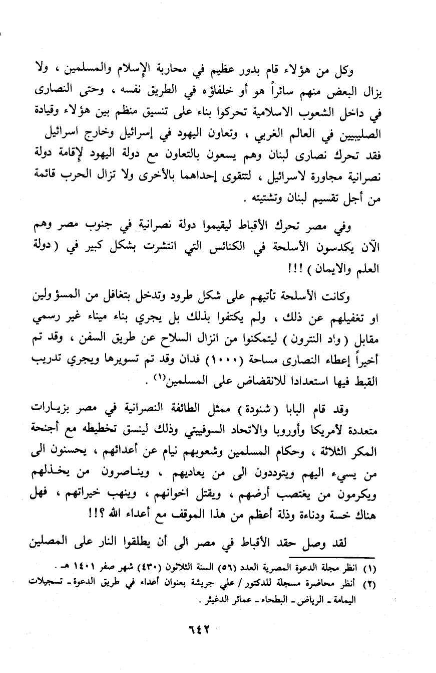 وقد قام البابا (شنودة) ممثل الطائفة النصرانية في مصر بزيارات متعددة لأمريكا وأوروبا والاتحاد السوفيت وذلك لينسق تخطيطه مع أجنحة المكر الثلاثة، وحكام المسلمين وشعوبهم نيام عن أعدائهم، يحسنون إلى من يسيء إليه ويتوددون إلى من يعاديهم، ويناصرون من يخذلهم ويكرمون من يغتصب أرضهم، ويقتل إخوانهم، وينهب خيراتهم، فهل هناك خسة ودناءة وذلة أعظم من هذا الموقف مع أعداء الله؟!! (¬2)