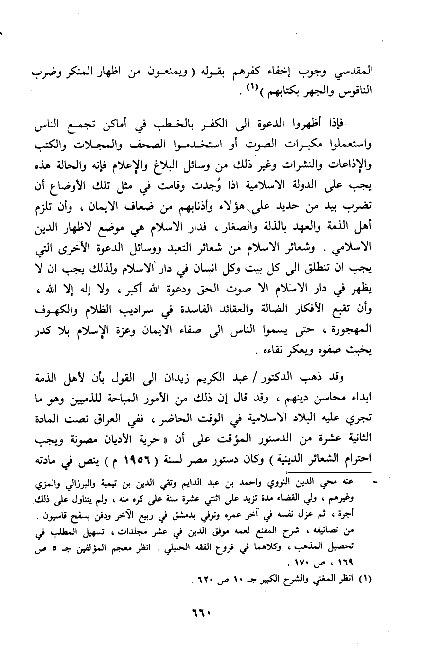 وقد ذهب الدكتور/ عبد الكريم زيدان إلى القول بأن لأهل الذمة إبداء محاسن دينهم، وقد قال إن ذلك من الأمور المباحة للذميين وهو ما تجري عليه البلاد الإسلامية في الوقت الحاضر، ففي العراق نصت المادة الثانية عشرة من الدستور المؤقت على أن «حرية الأديان مصونة ويجب احترام الشعائر الدينية» وكان دستور مصر لسنة (1956م) ينص في مادته