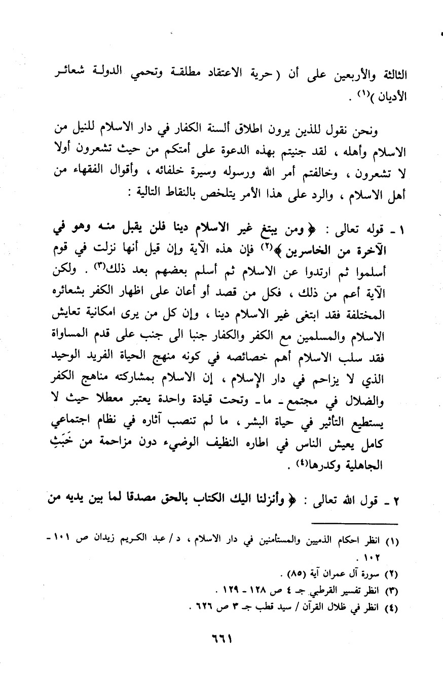 1 - قوله تعالى: (وَمَنْ يَبْتَغِ غَيْرَ الْإِسْلَامِ دِينًا فَلَنْ يُقْبَلَ مِنْهُ وَهُوَ فِي الْآَخِرَةِ مِنَ الْخَاسِرِينَ) (¬2)، فإن هذه الآية وإن قيل إنها نزلت في قوم أسلموا ثم ارتدوا عن الإسلام ثم أسلم بعضهم بعد ذلك (¬3). ولكن الآية أعم من ذلك، فكل من قصد أو أعان على إظهار الكفر بشعائره المختلفة فقد ابتغى غير الإسلام دينًا، وإن كل من يرى إمكانية تعايش الإسلام والمسلمين مع الكفر والكفار جنبًا إلى جنب على قدم المساواة فقد سلب الإسلام أهم خصائصه في كونه منهج الحياة الفريد الوحيد الذي لا يزاحم في دار الإسلام، إن الإسلام بمشاركته مناهج الكفر والضلال في مجتمع - ما - وتحت قيادة واحدة يعتبر معطلاً حيث لا يستطيع التأثير في حياة البشر، ما لم تنصب آثاره في نظام اجتماعي كامل يعيش الناس في إطاره النظيف الوضيء دون مزاحمة من خَبَثٍ الجاهلية وكدرها (¬4).