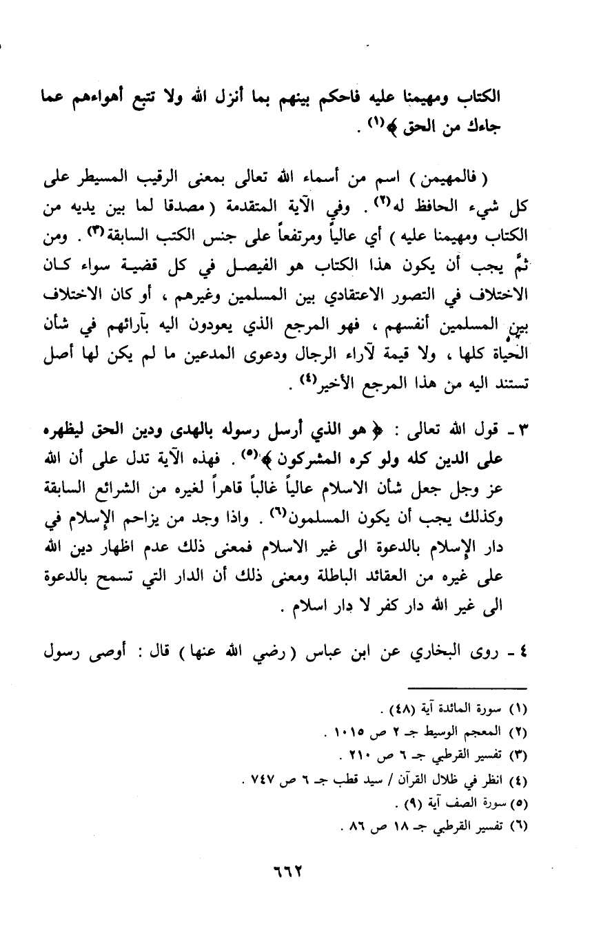 (فالمهيمن) اسم من أسماء الله تعالى بمعنى الرقيب المسيطر على كل شيء الحافظ له (¬2). وفي الآية المتقدمة (مصدقًا لما بين يديه من الكتاب ومهيمنًا عليه) أي عاليًا ومرتفعًا على جنس الكتب السابقة (¬3). ومن ثم يجب أن يكون هذا الكتاب هو الفيصل في كل قضية سواء كان الاختلاف في التصور الاعتقادي بين المسلمين وغيرهم، أو كان الاختلاف بين المسلمين أنفسهم، فهو المرجع الذي يعودون إليه بآرائهم في شأن الحياة كلها، ولا قيمة لآراء الرجال ودعوى المدعين ما لم يكن لها أصل تستند إليه من هذا المرجع الأخير (¬4).