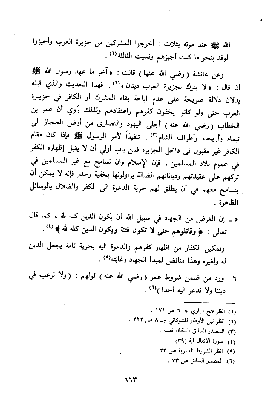 6 - ورد من ضمن شروط عمر (رضي الله عنه) قولهم: «ولا نرغب في ديننا ولا ندعو إليه أحدًا» (¬6).
