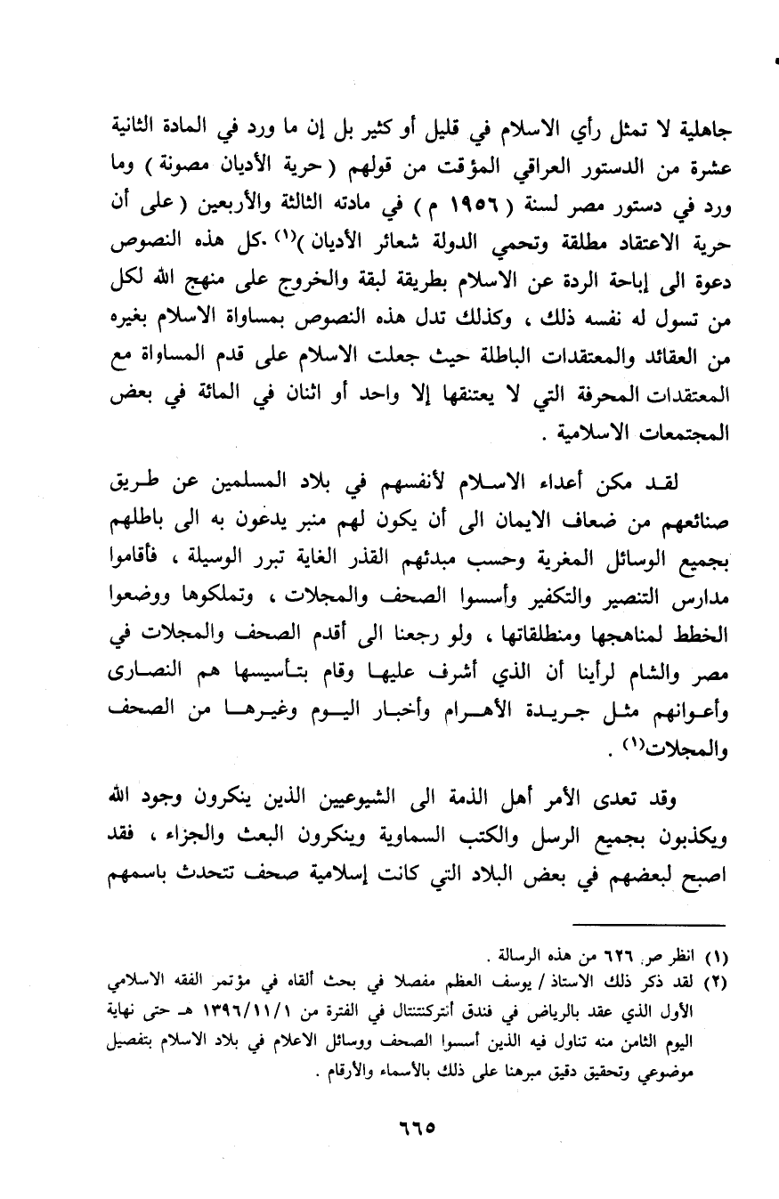 جاهلية لا تمثل رأي الإسلام في قليل أو كثير بل إن ما ورد في المادة الثانية عشرة من الدستور العراقي المؤقت من قولهم (حرية الأديان مصونة) وما ورد في دستور مصر لسنة (1956م) في مادته الثالثة والأربعين «على أن حرية الاعتقاد مطلقة وتحمي الدولة شعائر الأديان» (¬1). كل هذه النصوص دعوة إلى إباحة الردة عن الإسلام بطريقة لبقة والخروج على منهج الله لكل من تسول له نفسه ذلك، وكذلك تدل هذه النصوص بمساواة الإسلام بغيره من العقائد والمعتقدات الباطلة حيث جعلت الإسلام على قدم المساواة مع المحرفة التي لا يعتنقها إلا واحد أو اثنان في المائة في بعض المجتمعات الإسلامية.