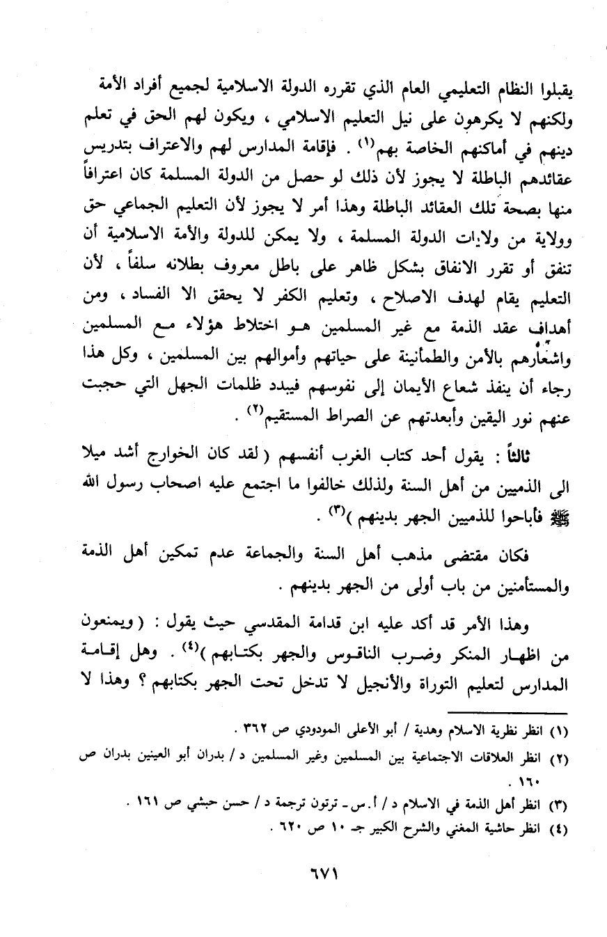 وهذا الأمر قد أكد عليه ابن قدامة المقدسي حيث يقول: «ويمنعون من إظهار المنكر وضرب الناقوس والجهر بكتابهم» (¬4). وهل إقامة المدارس لتعليم التوراة والإنجيل لا تدخل تحت الجهر بكتابهم؟ وهذا لا
