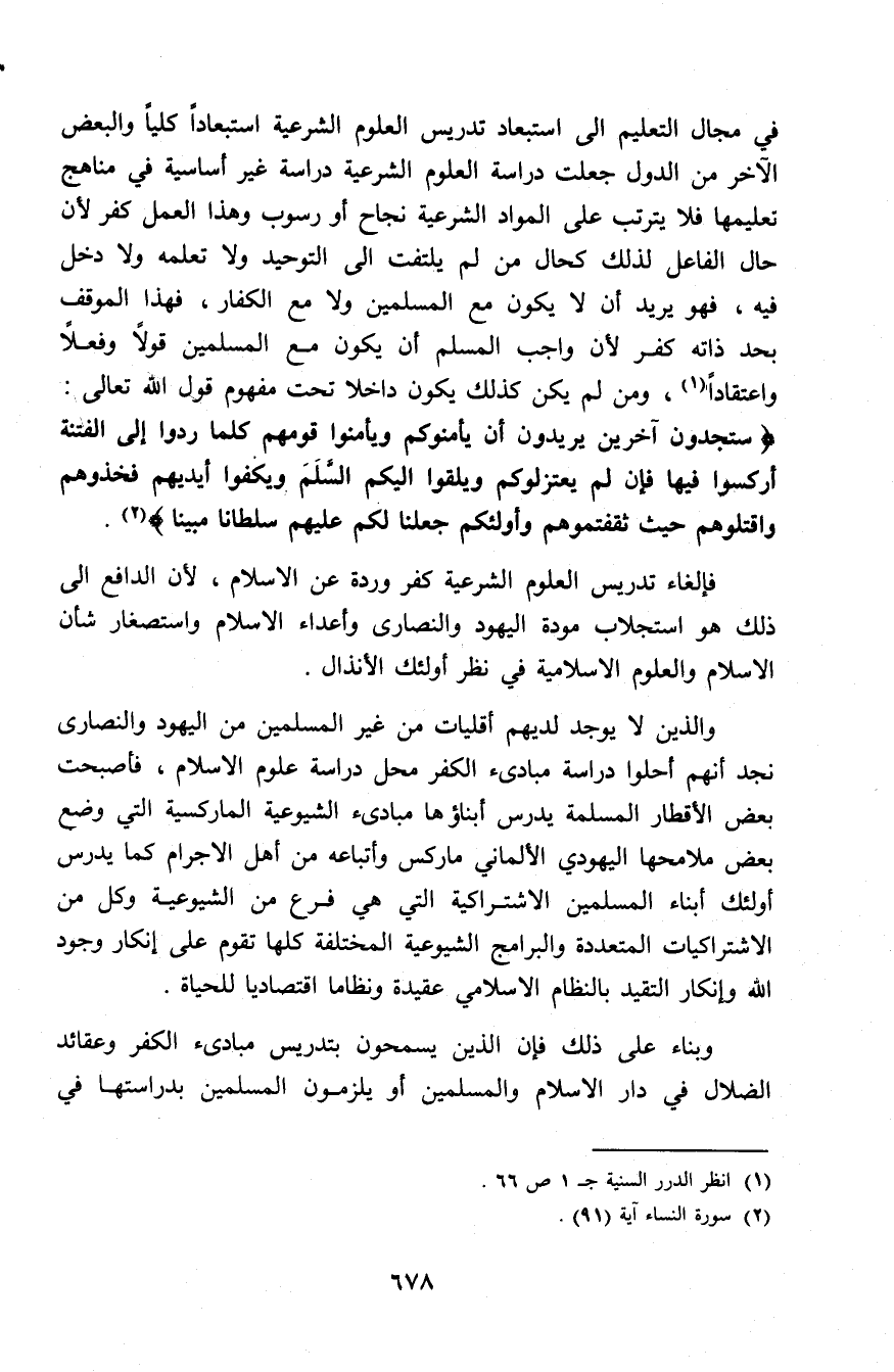 في مجال التعليم إلى استبعاد تدريس العلوم الشرعية استبعادًا كليًا والبعض الآخر من الدول جعلت دراسة العلوم الشرعية دراسة غير أساسية في مناهج تعليمها فلا يترتب على المواد الشرعية نجاح أو رسوب وهذا العمل كفر لأن حال الفاعل لذلك كحال من لم يلتفت إلى التوحيد ولا تعلمه ولا دخل فيه، فهو يريد أن لا يكون مع المسلمين ولا مع الكفار، فهذا الموقف بحد ذاته كفر لأن واجب المسلم أن يكون مع المسلمين قولاً وفعلاً واعتقادًا (¬1)، ومن لم يكن كذلك يكون داخلاً تحت مفهوم قول الله تعالى: (سَتَجِدُونَ آَخَرِينَ يُرِيدُونَ أَنْ يَأْمَنُوكُمْ وَيَأْمَنُوا قَوْمَهُمْ كُلَّ مَا رُدُّوا إِلَى الْفِتْنَةِ أُرْكِسُوا فِيهَا فَإِنْ لَمْ يَعْتَزِلُوكُمْ وَيُلْقُوا إِلَيْكُمُ السَّلَمَ وَيَكُفُّوا أَيْدِيَهُمْ فَخُذُوهُمْ وَاقْتُلُوهُمْ حَيْثُ ثَقِفْتُمُوهُمْ وَأُولَئِكُمْ جَعَلْنَا لَكُمْ عَلَيْهِمْ سُلْطَانًا مُبِينًا) (¬2).