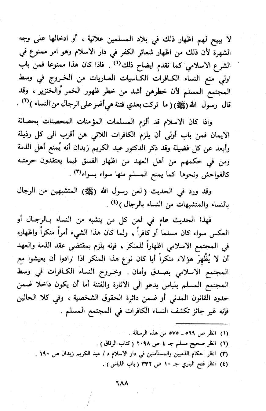 لا يبيح لهم إظهار ذلك في بلاد المسلمين علانية، أو إدخالها على وجه الشهرة لأن ذلك من إظهار شعائر الكفر في دار الإسلام وهو أمر ممنوع في الشرع الإسلامي كما تقدم إيضاح ذلك (¬1). فإذا كان هذا ممنوعًا فمن باب أولى منع النساء الكافرات الكاسيات العاريات من الخروج في وسط المجتمع المسلم لأن خطرهن أشد من خطر ظهور الخمر والخنزير، وقد قال رسول الله - صلى الله عليه وسلم - «ما تركت بعدي فتنة هي أضر على الرجال من النساء» (¬2).
