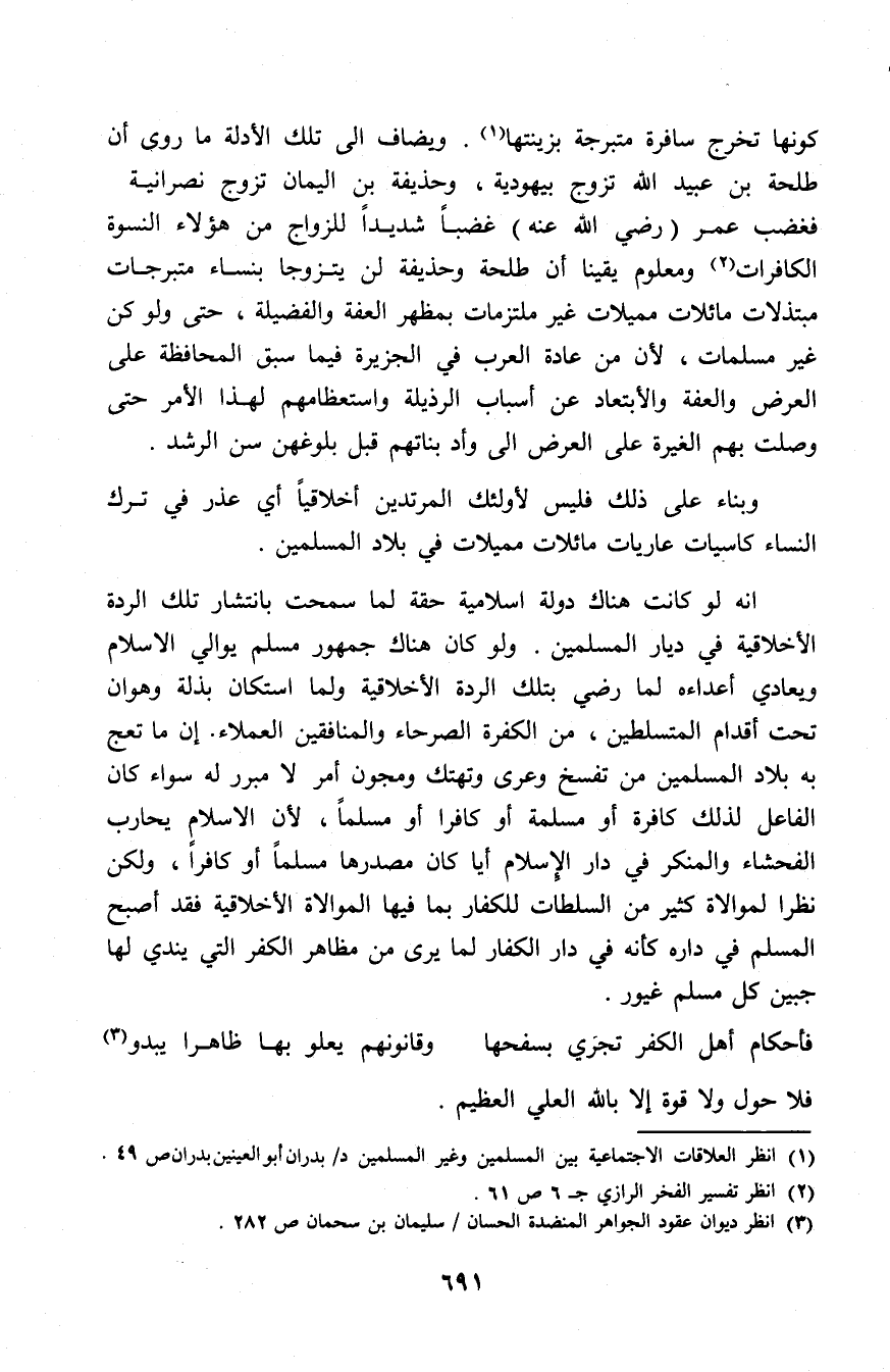 إنه لو كانت هناك دولة إسلامية حقة لما سمحت بانتشار تلك الردة الأخلاقية في ديار المسلمين. ولو كان هناك جمهور مسلم يوالي الإسلام ويعادي أعداءه لما رضي بتلك الردة الأخلاقية ولما استكان بذلة وهوان تحت أقدام المتسلطين، من الكفرة الصرحاء والمنافقين العملاء. إن ما تعج به بلاد المسلمين من تفسخ وعرى وتهتك ومجون أمر لا مبرر له سواء كان الفاعل لذلك كافرة أو مسلمة أو كافرًا أو مسلمًا، لأن الإسلام يحارب الفحشاء والمنكر في دار الإسلام أيا كان مصدرها مسلمًا أو كافرًا، ولكن نظرًا لموالاة كثير من السلطات للكفار بما فيها الموالاة الأخلاقية فقد أصبح المسلم في داره كأنه في دار الكفار لما يرى من مظاهر الكفر التي يندى لها جبين كل مسلم غيور.