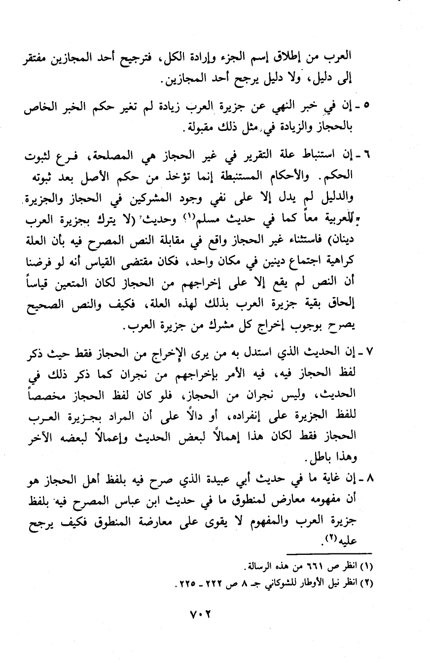 6 - إن استنباط علة التقرير في غير الحجاز هي المصلحة، فرع لثبوت الحكم. والأحكام المستنبطة إنما تؤخذ من حكم الأصل بعد ثبوته والدليل لم يدل إلا على نفي وجود المشركين في الحجاز والجزيرة العربية معًا كما في حديث مسلم (¬1) وحديث: «لا يترك بجزيرة العرب دينان» فاستثناء غير الحجاز واقع في مقابلة النص المصرح فيه بأن العلة كراهية اجتماعي دينين في مكان واحد، فكان مقتضى القياس أنه لو فرضنا أن النص لم يقع إلا على إخراجهم من الحجاز لكان المتعين قياسًا إلحاق بقية جزيرة العرب بذلك لهذه العلة، فكيف والنص الصحيح يصرح بوجوب إخراج كل مشرك من جزيرة العرب.