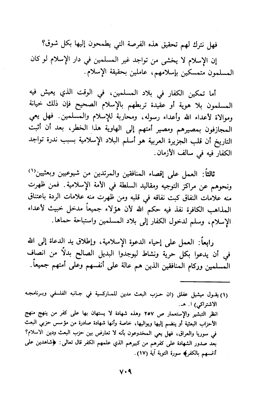 انظر التبشير والاستعمار ص257 وهذه شهادة لا يستهان بها على كفر من ينهج منهج الأحزاب البعثية أو ينضم إليها ويواليها، خاصة وأنها شهادة صادرة من مؤسس حزبي البعث في سوريا والعراق، فهل يعي المخدوعون بأنه لا تعارض بين حزب البعث ودين الإسلام؟ بعد صدور الشهادة على كفرهم من كبيرهم الذي علمهم الكفر قال تعالى: {شَاهِدِينَ عَلَى أَنْفُسِهِمْ بِالْكُفْرِ) سورة التوبة آية (17).