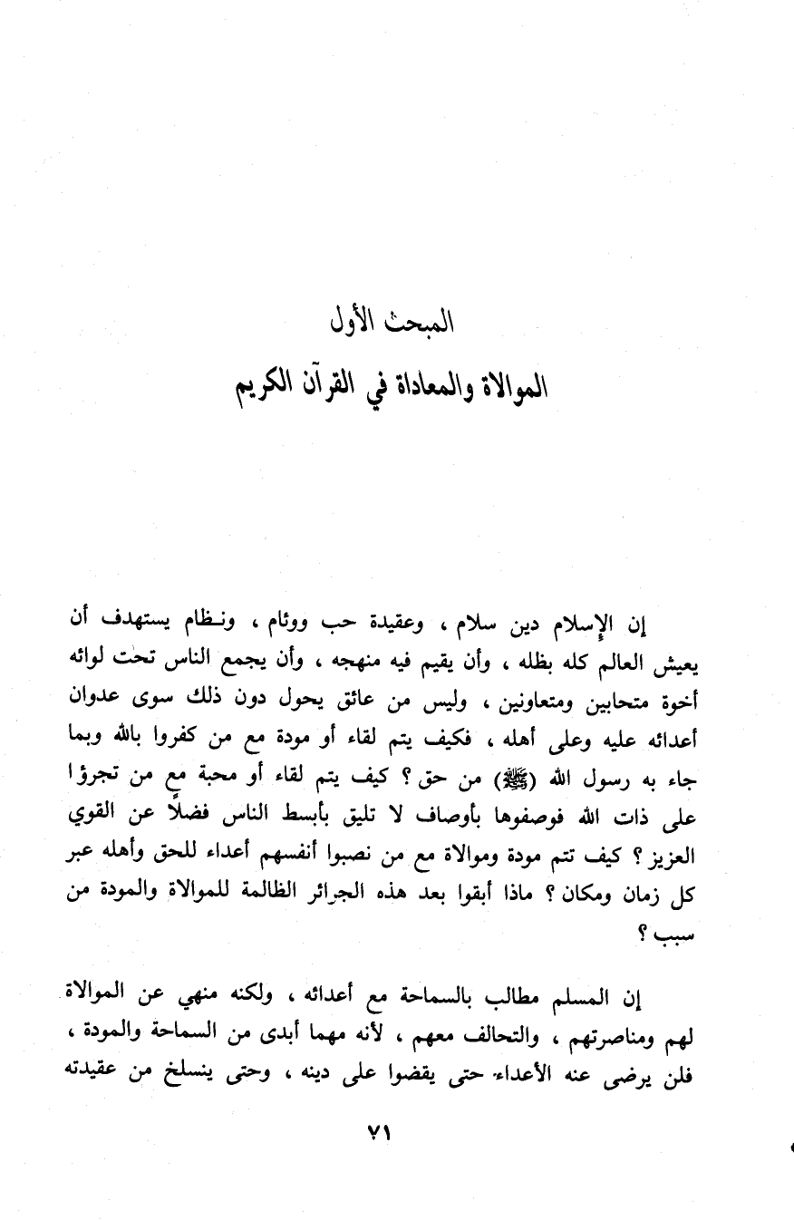 إن الإسلام دين سلام، وعقيدة حب ووئام، ونظام يستهدف أن يعيش العالم كله بظلِّه، وأن يقيم فيه منهجه، وأن يجمع الناس تحت لوائه إخوة متحابين ومتعاونين، وليس من عائق يحول دون ذلك سوى عدوان أعدائه عليه وعلى أهله، فكيف يتم لقاء أو مودة مع من كفروا بالله وبما جاء به رسول الله - صلى الله عليه وسلم - من حق؟ كيف يتم لقاء أو محبة مع من تجرءوا على ذات الله فوصفوها بأوصاف لا تليق بأبسط الناس فضلاً عن القوي العزيز؟ كيف تتم مودة وموالاة مع من نصَّبوا أنفسهم أعداء للحق وأهله عبر كل زمان ومكان؟ ماذا أبوا بعد هذه الجرائر الظالمة للموالاة والمودة من سبب؟