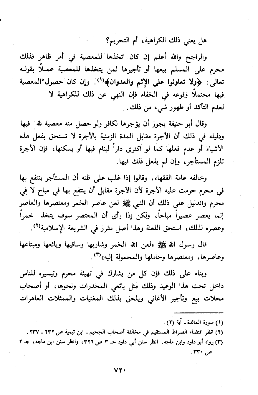 وخالفه عامة الفقهاء، وقالوا: إذا غلب على ظنه أن المستأجر ينتفع بها في محرم حرمت عليه الأجرة لأن الأجرة مقابل أن ينتفع بها في مباح لا في محرم والدليل على ذلك أن النبي - صلى الله عليه وسلم - لعن عاصر الخمر ومعتصرها والعاصر إنما يعصر عصيرًا مباحًا، ولكن إذا رأى أن المعتصر سوف يتخذ خمرًا وعصره لذلك، استحق اللعنة وهذا أصل مقرر في الشريعة الإسلامية (¬2).