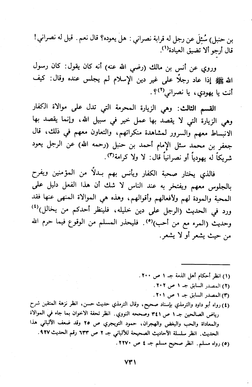 القسم الثالث: وهي الزيارة المحرمة التي تدل على موالاة الكفار وهي الزيارة التي لا يقصد بها عمل خير في سبيل الله، وإنما يقصد بها الانبساط معهم والسرور لمشاهدة منكراتهم، والتعاون معهم في ذلك، قال جعفر بن محمد سئل الإمام أحمد بن حنبل (رحمه الله) عن الرجل يعود شريكًا له يهوديًا أو نصرانيًا؟ قال: لا ولا كرامة (¬3).