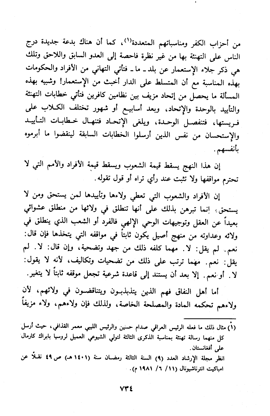 من أحزاب الكفر ومناسباتهم المتعددة (¬1)، كما أن هناك بدعة جديدة درج الناس على التهنئة بها من غير نظرة فاحصة إلى العدو السابق واللاحق وتلك هي ذكر جلاء الاستعمار عن بلد - ما - فتأتي التهاني من الأفراد والحكومات بهذه المناسبة مع أن المتسلط على الدار أخبث من الاستعمار! وشبيه بهذه المسألة ما يحصل من اتحاد مزيف بين نظامين كافرين فتأتي خطابات التهنئة والتأييد بالوحدة والاتحاد، وبعد أسابيع أو شهور تختلف الكلاب على فريستها، فتنفصل الوحدة، ويلغى الاتحاد فتنهال خطابات التأييد والاستحسان من نفس الذين أرسلوا الخطابات السابقة لينقضوا ما أبرموه بأنفسهم.