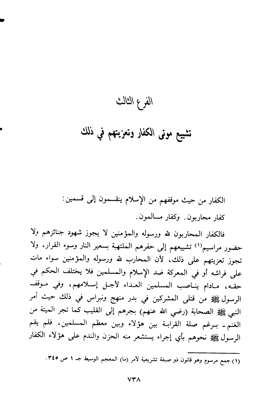 فالكفار المحاربون لله ورسوله والمؤمنين لا يجوز شهود جنائزهم ولا حضور مراسيم (¬1) تشييعهم إلى حفرهم الملتهبة بعسير النار وسوء القرار، ولا تجوز تعزيتهم على ذلك، لأن المحارب لله ورسوله والمؤمنين سواء مات على فراشه أو في المعركة ضد الإسلام والمسلمين فلا يختلف الحكم في حقه، ما دام يناصب المسلمين العداء لأجل إسلامهم، وفي موقف الرسول - صلى الله عليه وسلم - من قتلى المشركين في بدر منهج ونبراس في ذلك حيث أمر النبي - صلى الله عليه وسلم - الصحابة (رضي الله عنهم) بجرهم إلى القليب كما تجر الميتة من الغنم -برغم صلة القرابة بين هؤلاء وبين معظم المسلمين- فلم يقم الرسول - صلى الله عليه وسلم - نحوهم بأي إجراء يستشعر منه الحزن والندم على هؤلاء الكفار