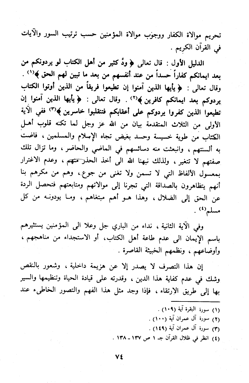 الدليل الأول: قال تعالى: (وَدَّ كَثِيرٌ مِنْ أَهْلِ الْكِتَابِ لَوْ يَرُدُّونَكُمْ مِنْ بَعْدِ إِيمَانِكُمْ كُفَّارًا حَسَدًا مِنْ عِنْدِ أَنْفُسِهِمْ مِنْ بَعْدِ مَا تَبَيَّنَ لَهُمُ الْحَقُّ) [البقرة: 109] وقال تعالى: (يَا أَيُّهَا الَّذِينَ آمَنُوا إِنْ تُطِيعُوا فَرِيقًا مِنَ الَّذِينَ أُوتُوا الْكِتَابَ يَرُدُّوكُمْ بَعْدَ إِيمَانِكُمْ كَافِرِينَ) [آل عمران: 100] وقال تعالى: (يَا أَيُّهَا الَّذِينَ آمَنُوا إِنْ تُطِيعُوا الَّذِينَ كَفَرُوا يَرُدُّوكُمْ عَلَى أَعْقَابِكُمْ فَتَنْقَلِبُوا خَاسِرِينَ) [آل عمران: 149] ففي الآية الأولى من الثلاث المتقدمة بيان من الله عز وجل لما تكنه قلوب أهل الكتاب من طوية خسيسة وحسد بغيض تجاه الإسلام والمسلمين، فاضت به ألسنتهم وانبعثت منه دسائسهم في الماضي والحاضر، وما تزال تلك صفتهم لا تتغير، ولذلك نبهنا الله إلى أخذ الحذر منهم، وعدم الاغترار بمعسول الألفاظ التي لا تسمن ولا تغني من جوع، وهم من مكرهم بنا أنهم يتظاهرون بالصداقة التي تجرنا إلى موالاتهم ومتابعتهم فتحصل الردة عن الحق إلى الضلال، وهذا هو أهم مبتغاهم، وما يودونه من كل مسلم (¬1).