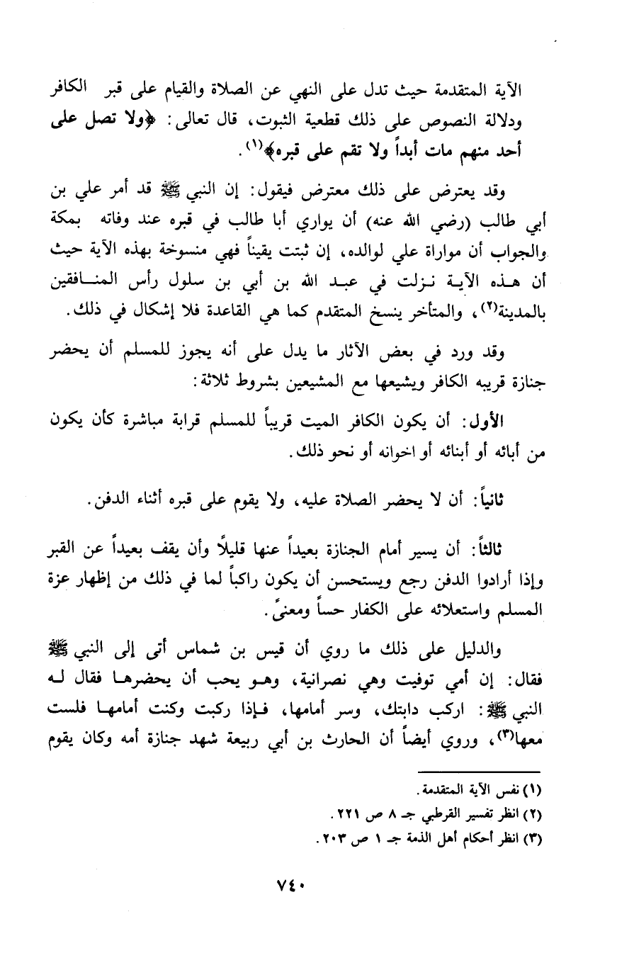 الآية المتقدمة حيث تدل على النهي عن الصلاة والقيام على قبر الكافر ودلالة النصوص على ذلك قطعية الثبوت، قال تعالى: (وَلَا تُصَلِّ عَلَى أَحَدٍ مِنْهُمْ مَاتَ أَبَدًا وَلَا تَقُمْ عَلَى قَبْرِهِ) (¬1).