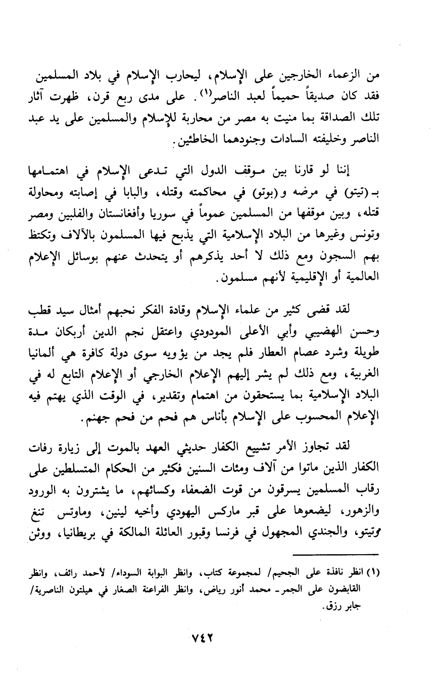 من الزعماء الخارجين على الإسلام، ليحارب الإسلام في بلاد المسلمين فقد كان صديقًا حميمًا لعبد الناصر (¬1). على مدى ربع قرن، ظهرت آثار تلك الصداقة بما منيت به مصر من محاربة للإسلام والمسلمين على يد عبد الناصر وخليفته السادات وجنودهما الخاطئين.