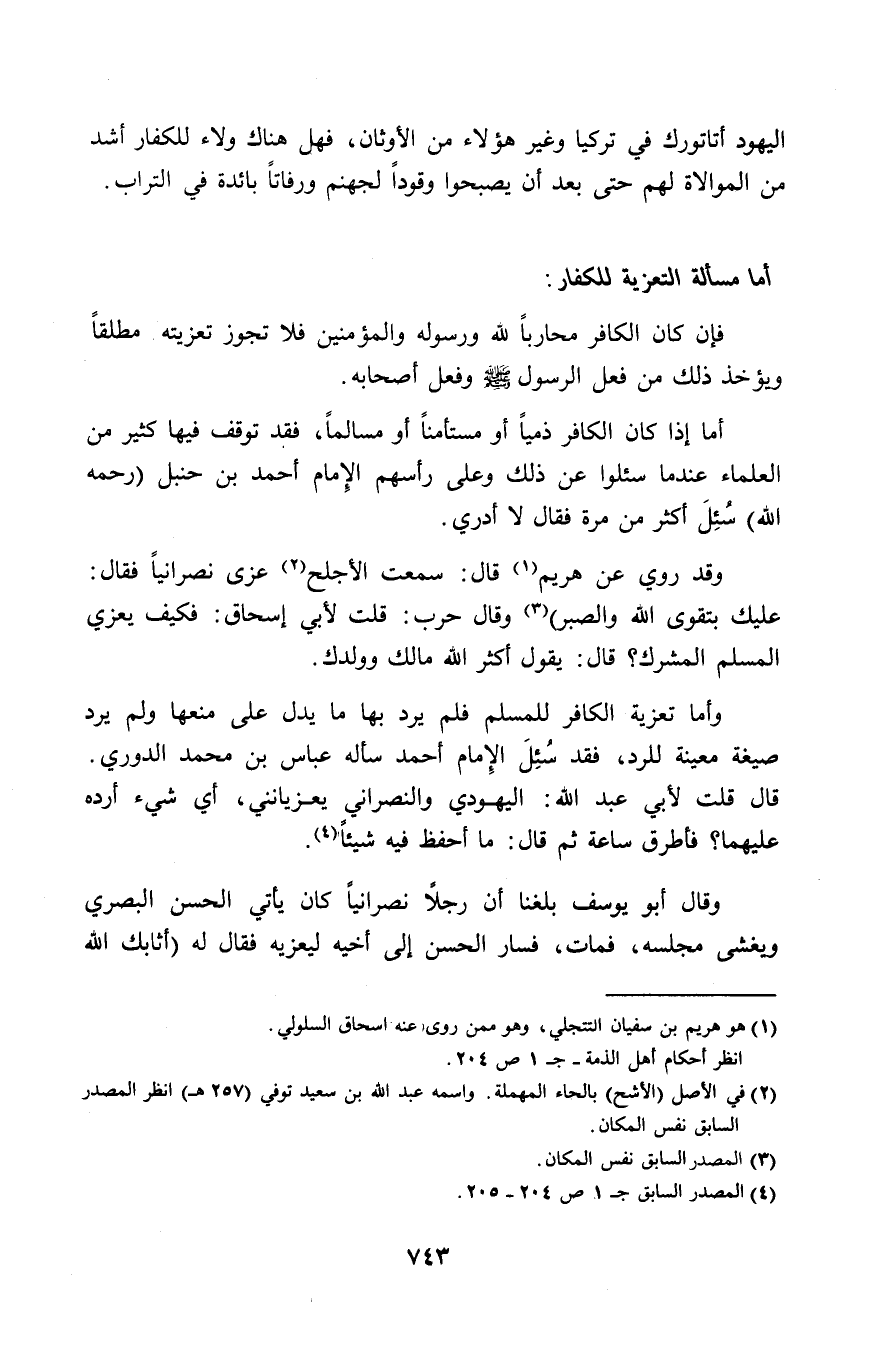 وقد روي عن هريم (¬1) قال: سمعت الأجلح (¬2) عزى نصرانيًا فقال: عليك بتقوى الله والصبر (¬3)، وقال حرب: قلت لأبي إسحاق: فكيف يعزي المسلم المشرك؟ قال: يقول أكثر الله مالك وولدك.