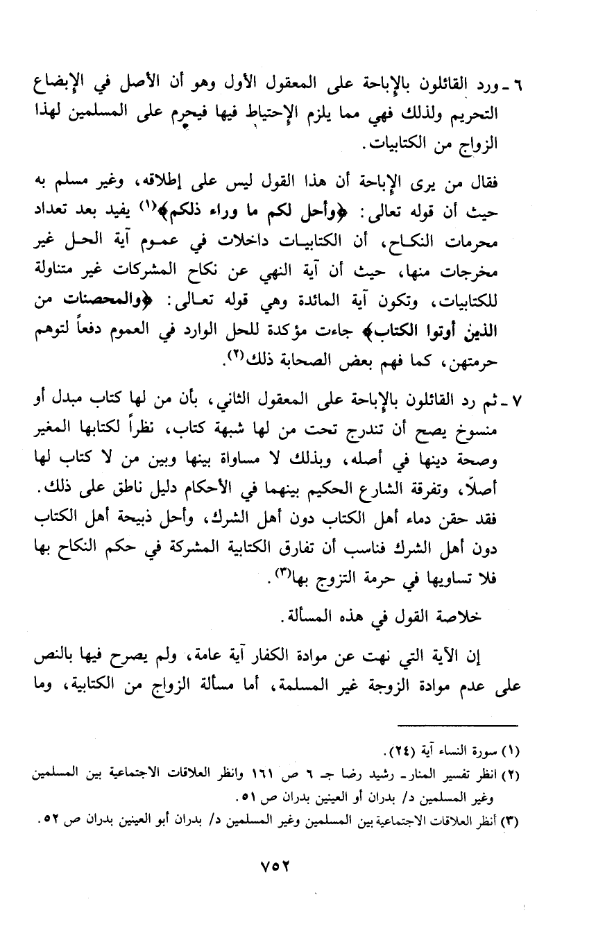 (¬2) انظر تفسير المنار - رشيد رضا ج6 ص161 وانظر العلاقات الاجتماعية بين المسلمين وغير المسلمين د/ بدران أبو العينين بدران ص51.