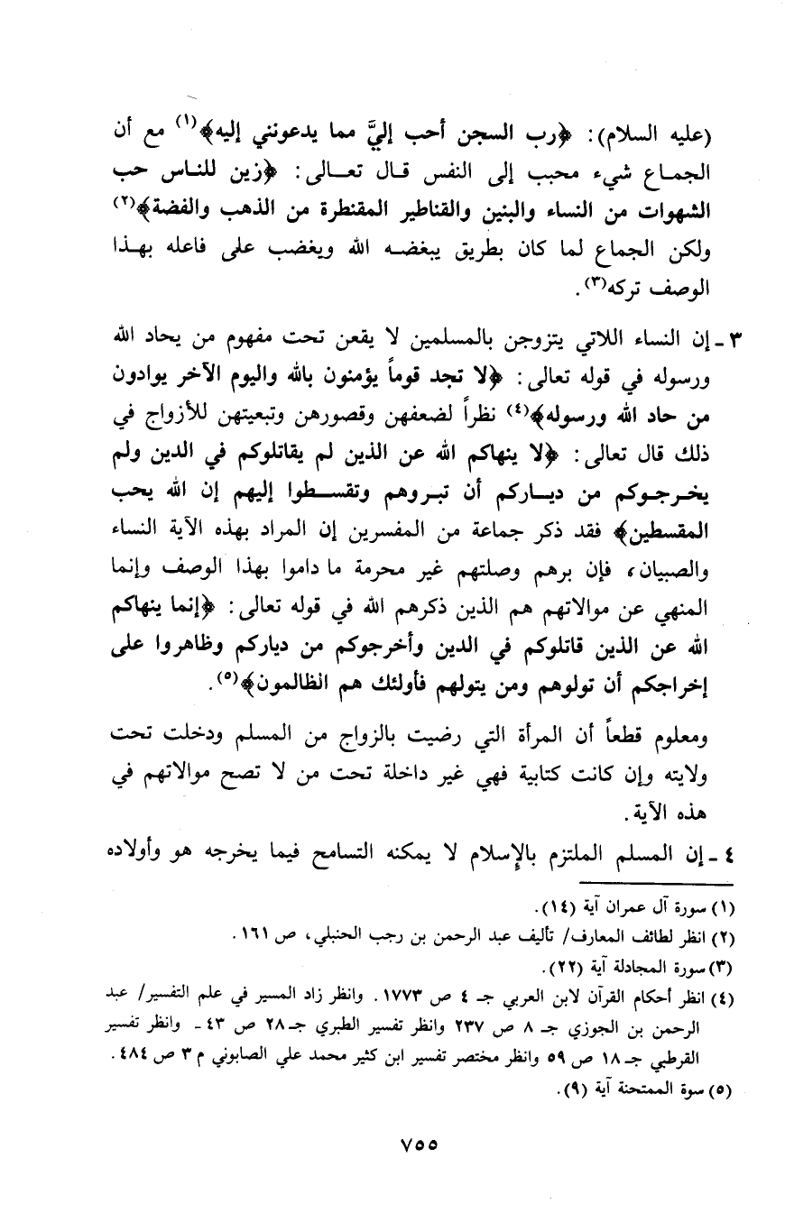 3 - إن النساء اللاتي يتزوجن بالمسلمين لا يقعن تحت مفهوم من يحاد الله ورسوله في قوله تعالى: (لَا تَجِدُ قَوْمًا يُؤْمِنُونَ بِاللَّهِ وَالْيَوْمِ الْآَخِرِ يُوَادُّونَ مَنْ حَادَّ اللَّهَ وَرَسُولَهُ) (¬4) نظرًا لضعفهن وقصورهن وتبعيتهن للأزواج في ذلك قال تعالى: (لَا يَنْهَاكُمُ اللَّهُ عَنِ الَّذِينَ لَمْ يُقَاتِلُوكُمْ فِي الدِّينِ وَلَمْ يُخْرِجُوكُمْ مِنْ دِيَارِكُمْ أَنْ تَبَرُّوهُمْ وَتُقْسِطُوا إِلَيْهِمْ إِنَّ اللَّهَ يُحِبُّ الْمُقْسِطِينَ) (¬5) فقد ذكر جماعة من المفسرين إن المراد بهذه الآية النساء والصبيان، فإن برهم وصلتهم غير محرمة ما داموا بهذا الوصف وإنما المنهي عن موالاتهم هم الذين ذكرهم الله في قوله تعالى: (إِنَّمَا يَنْهَاكُمُ اللَّهُ عَنِ الَّذِينَ قَاتَلُوكُمْ فِي الدِّينِ وَأَخْرَجُوكُمْ مِنْ دِيَارِكُمْ وَظَاهَرُوا عَلَى إِخْرَاجِكُمْ أَنْ تَوَلَّوْهُمْ وَمَنْ يَتَوَلَّهُمْ فَأُولَئِكَ هُمُ الظَّالِمُونَ) (¬6).