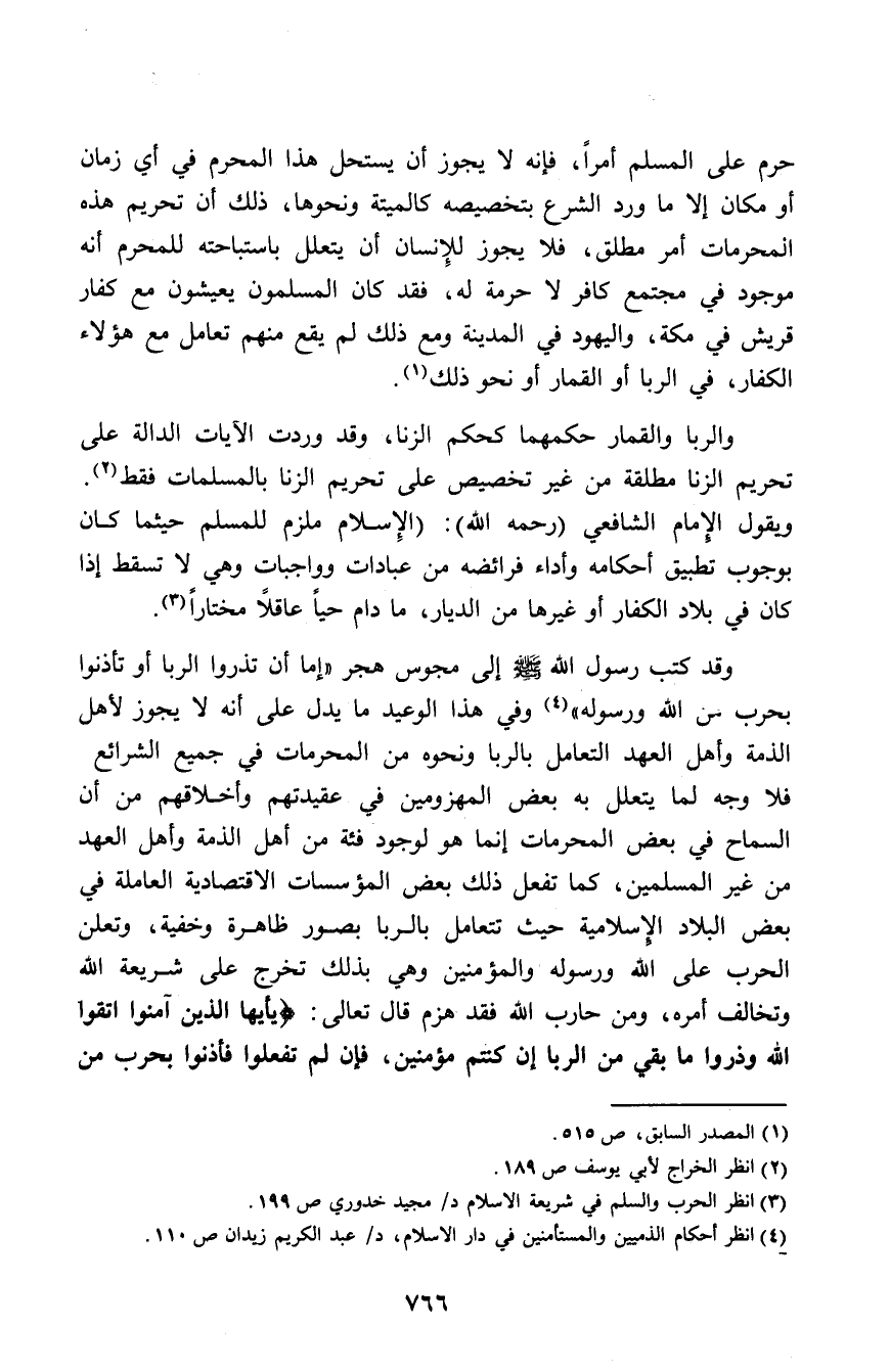 والربا والقمار حكمهما كحكم الزنا، وقد وردت الآيات الدالة على تحريم الزنا مطلقة من غير تخصيص على تحريم الزنا بالمسلمات فقط (¬2). ويقول الإمام الشافعي (رحمه الله): «الإسلام ملزم للمسلم حيثما كان بوجوب تطبيق أحكامه وأداء فرائضه من عبادات وواجبات وهي لا تسقط إذا كان في بلاد الكفار أو غيرها من الديار، ما دام حيًا عاقلاً مختارًا» (¬3).