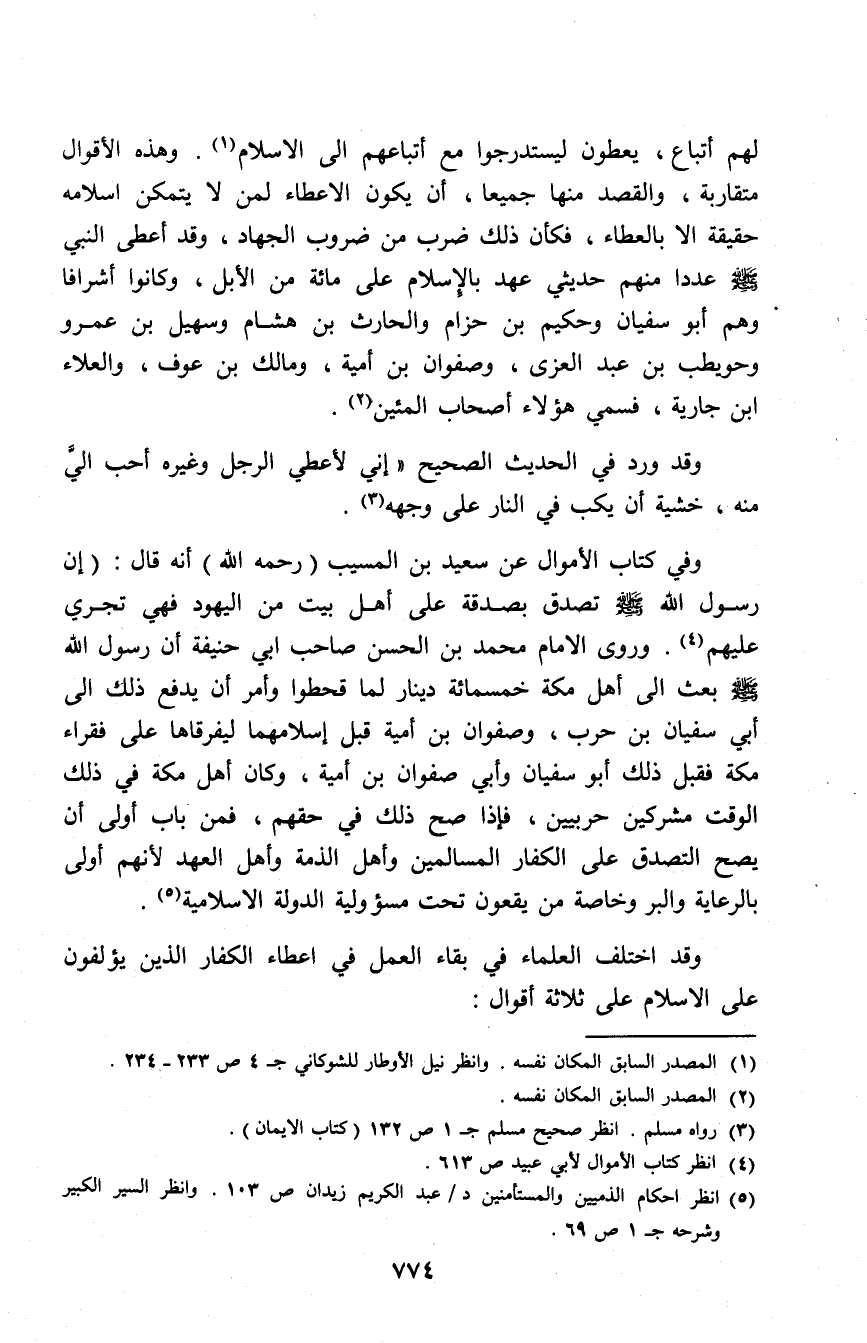 لهم أتباع، يعطون ليستدرجوا مع أتباعهم إلى الإسلام (¬1). وهذه الأقوال متقاربة، والقصد منها جميعًا، أن يكون الإعطاء لمن لا يتمكن إسلامه حقيقة إلا بالعطاء، فكأن ذلك ضرب من ضروب الجهاد، وقد أعطى النبي - صلى الله عليه وسلم - عددًا منهم حديثي عهد بالإسلام على مائة من الإبل، وكانوا أشرافًا وحويطب بن عبد العزي، وصفوان بن أمية، ومالك بن عوف، والعلاء بن جارية، فسمي هؤلاء أصحاب المئين (¬2).