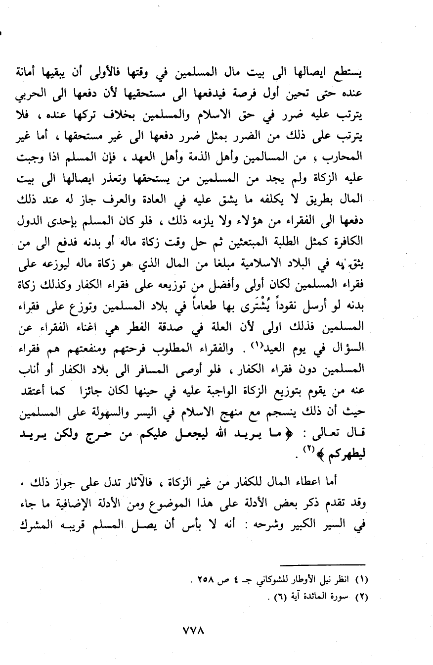 يستطع إيصالها إلى بيت مال المسلمين في وقتها فالأولى أن يبقيها أمانة عنده حتى تحين أول فرصة فيدفعها إلى مستحقيها لأن دفعها إلى الحربي يترتب عليه ضرر في حق الإسلام والمسلمين بخلاف تركها عنده، فلا يترتب على ذلك من الضرر بمثل ضرر دفعها إلى غير مستحقها، أما غير المحارب، من المسالمين وأهل الذمة وأهل العهد، فإن المسلم إذا وجبت عليه الزكاة ولم يجد من المسلمين من يستحقها وتعذر إيصالها إلى بيت المال بطريق لا يكلفه ما يشق عليه في العادة والعرف جاز له عند ذلك دفعها إلى الفقراء من هؤلاء ولا يلزمه ذلك، فلو كان المسلم بإحدى الدول الكافرة كمثل الطلبة المبتعثين ثم حل وقت زكاة ماله أو بدنه فدفع إلى من يثق به في البلاد الإسلامية مبلغًا من المال الذي هو زكاة ماله ليوزعه على فقراء المسلمين لكان أولى وأفضل من توزيعه على فقراء الكفار وكذلك زكاة بدنه لو أرسل نقودًا يشتري بها طعامًا في بلاد المسلمين وتوزع على فقراء المسلمين فذلك أولى لأن العلة في صدقة الفطر هي إغناء الفقراء عن السؤال في يوم العيد (¬1). والفقراء المطلوب فرحتهم ومنفعتهم هم فقراء المسلمين دون فقراء الكفار، فلو أوصى المسافر إلى بلاد الكفار أو أناب عنه من يقوم بتوزيع الزكاة الواجبة عليه في حينها لكان جائزًا كما أعتقد حيث إن ذلك ينسجم مع منهج الإسلام في اليسر والسهولة على المسلمين قال تعالى: (مَا يُرِيدُ اللَّهُ لِيَجْعَلَ عَلَيْكُمْ مِنْ حَرَجٍ وَلَكِنْ يُرِيدُ لِيُطَهِّرَكُمْ) (¬2).