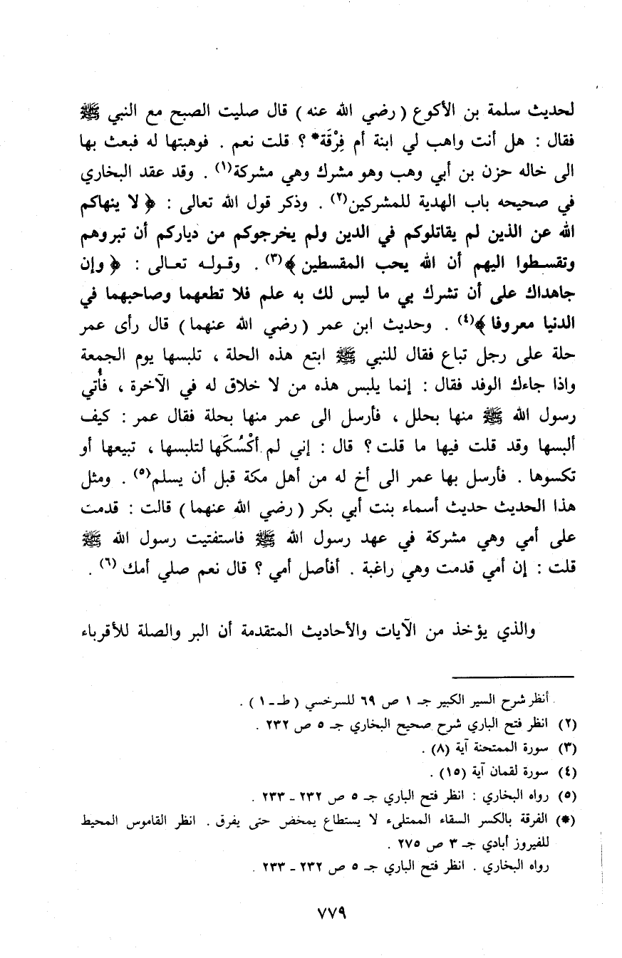 وقوله تعالى: (وَإِنْ جَاهَدَاكَ عَلى أَنْ تُشْرِكَ بِي مَا لَيْسَ لَكَ بِهِ عِلْمٌ فَلَا تُطِعْهُمَا وَصَاحِبْهُمَا فِي الدُّنْيَا مَعْرُوفًا) (¬4). وحديث ابن عمر (رضي الله عنهما) قال رأي عمر حلة على رجل تباع فقال للنبي - صلى الله عليه وسلم - ابتع هذه الحلة، تلبسها يوم الجمعة وإذا جاءك الوفد فقال: إنما يلبس هذه من لا خلاق له في الآخرة، فأتي رسول الله - صلى الله عليه وسلم - منها بحلل، فأرسل إلى عمر منها بحلة فقال عمر: كيف ألبسها وقد قلت فيها ما قلت؟ قال: إني لم أكْسُكها لتلبسها، تبيعها أو تكسوها. فأرسل بها عمر إلى أخ له من أهل مكة قبل أن يسلم (¬5).