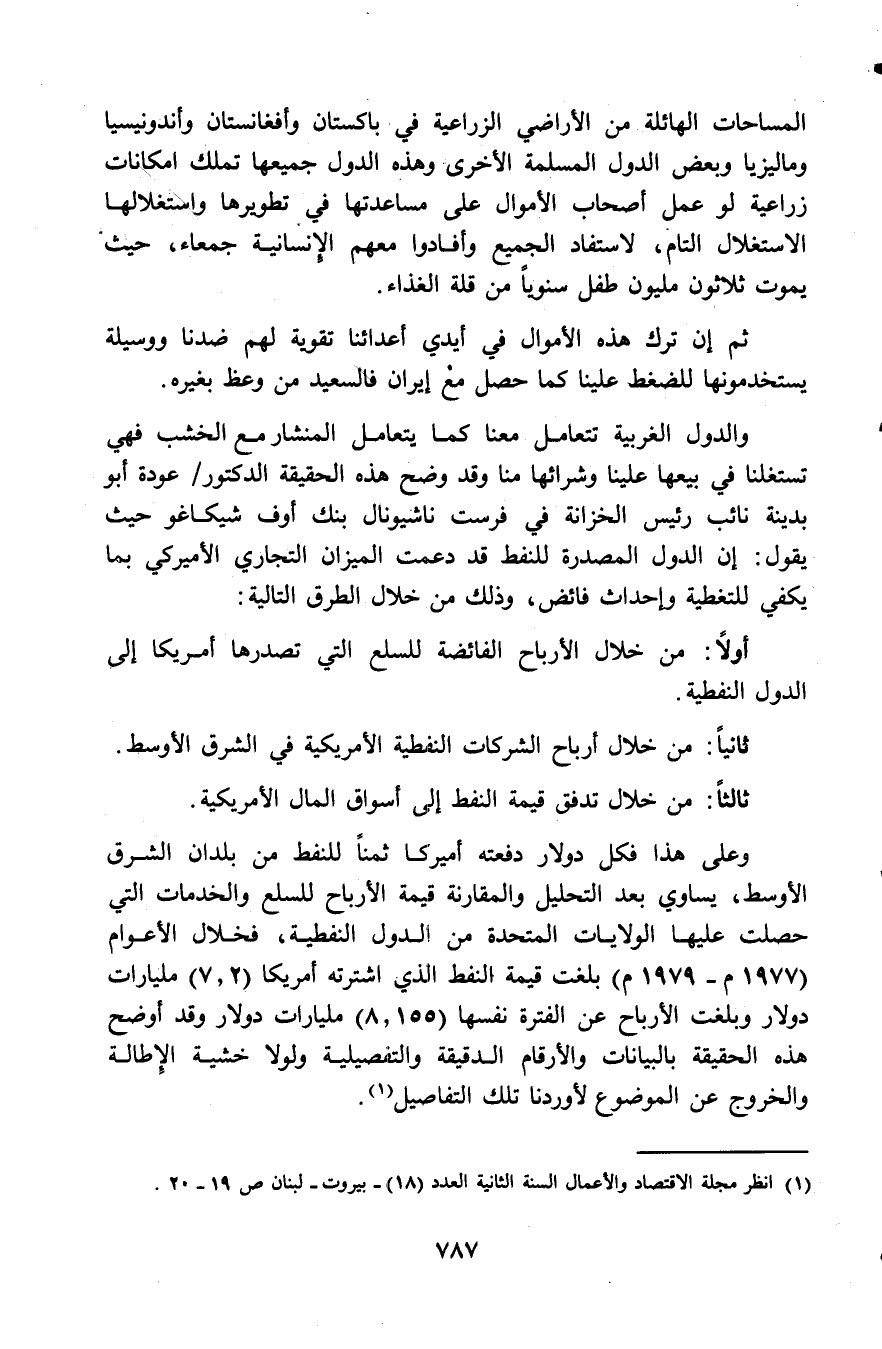 وعلى هذا فكل دولار دفعته أمريكا ثمنًا للنفط من بلدان الشرق الأوسط، يساوي بعد التحليل والمقارنة قيمة الأرباح للسلع والخدمات التي حصلت عليها الولايات المتحدة من الدول النفطية، فخلال الأعوام (1977م - 1979م) بلغت قيمة النفط الذي اشترته أمريكا (7.2) مليارات دولار وبلغت الأرباح عن الفترة نفسها (8.155) مليارات دولار وقد أوضح هذه الحقيقة بالبيانات والأرقام الدقيقة والتفصيلية ولولا خشية الإطالة والخروج عن الموضوع لأوردنا تلك التفاصيل (¬1).