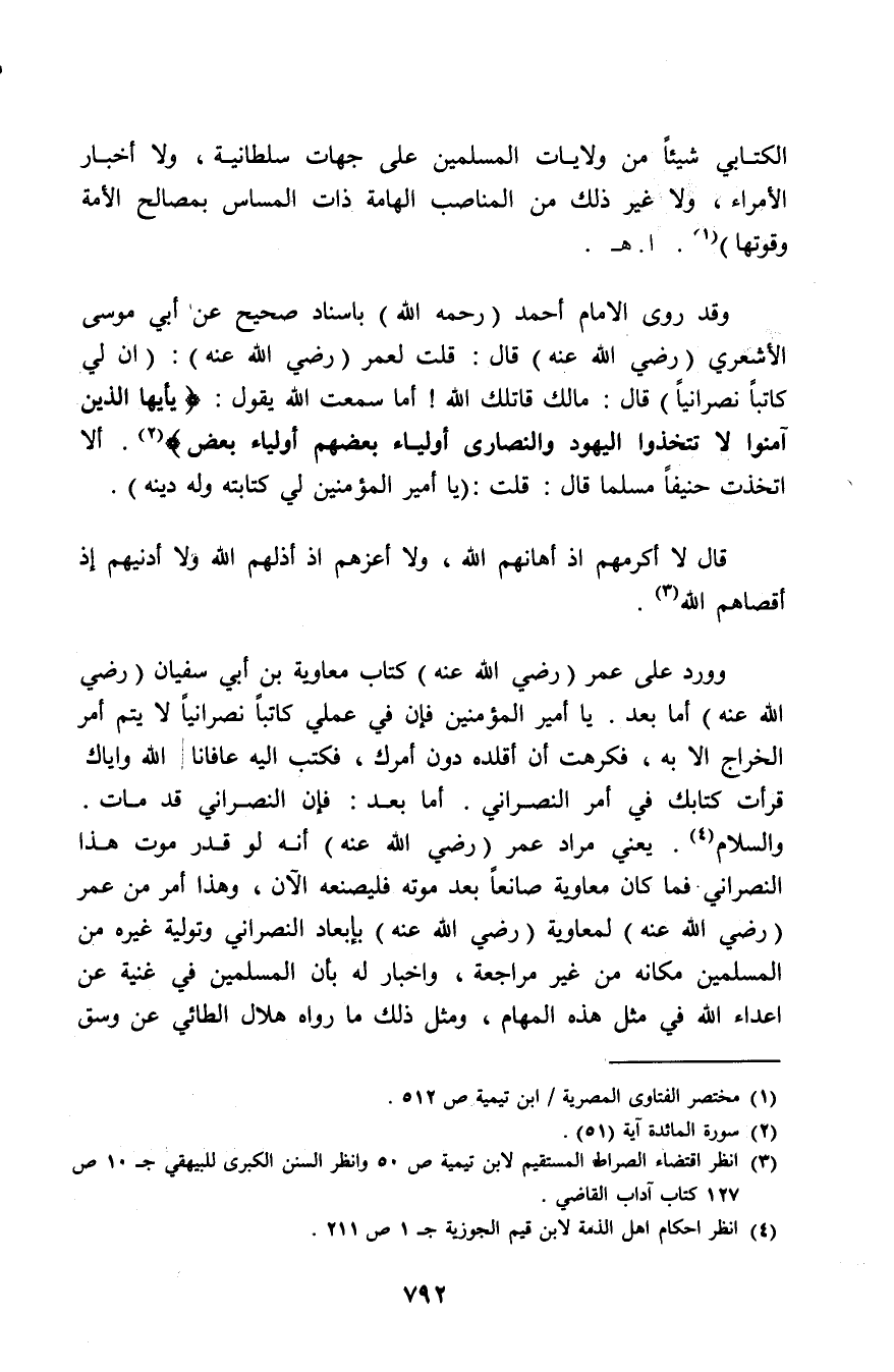 وقد روى الإمام أحمد (رحمه الله) بإسناد صحيح عن أبي موسى الأشعري (رضي الله عنه) قال: قلت لعمر (رضي الله عنه): «إن لي كاتبًا نصرانيًا» قال: مالك قاتلك الله! أما سمعت الله يقول: (يَا أَيُّهَا الَّذِينَ آَمَنُوا لَا تَتَّخِذُوا الْيَهُودَ وَالنَّصَارَى أَوْلِيَاءَ بَعْضُهُمْ أَوْلِيَاءُ بَعْضٍ) (¬2). ألا اتخذت حنيفًا مسلمًا قال. قلت: «يا أمير المؤمنين لي كتابته وله دينه».