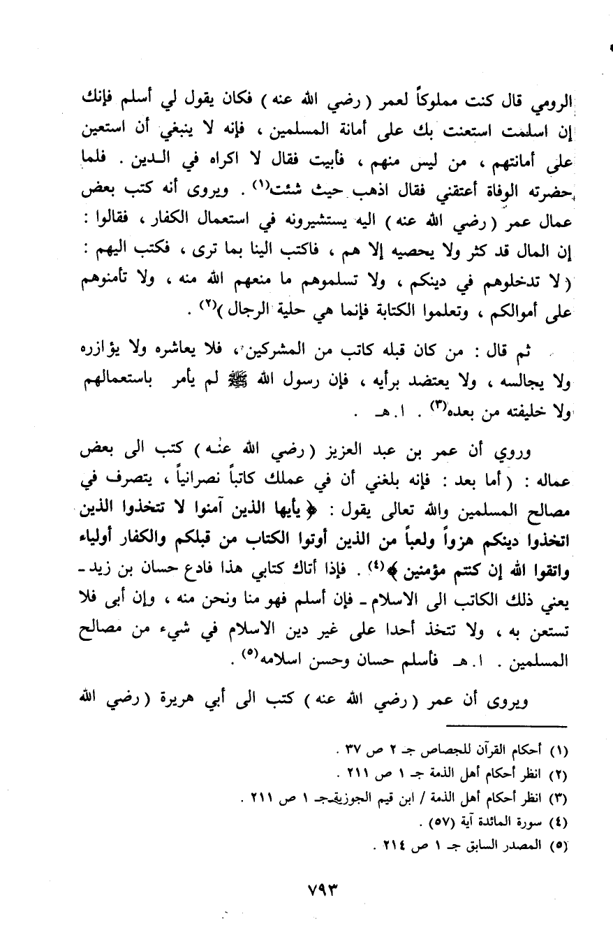 وروي أن عمر بن عبد العزيز (رضي الله عنه) كتب إلى بعض عماله. «أما بعد: فإنه بلغني أن في عملك كاتبًا نصرانيًا، يتصرف في مصالح المسلمين والله تعالى يقول: (يَا أَيُّهَا الَّذِينَ آَمَنُوا لَا تَتَّخِذُوا الَّذِينَ اتَّخَذُوا دِينَكُمْ هُزُوًا وَلَعِبًا مِنَ الَّذِينَ أُوتُوا الْكِتَابَ مِنْ قَبْلِكُمْ وَالْكُفَّارَ أَوْلِيَاءَ وَاتَّقُوا اللَّهَ إِنْ كُنْتُمْ مُؤْمِنِينَ) (¬4). فإذا أتاك كتابي هذا فادع حسان بن زيد -يعني ذلك الكاتب إلى الإسلام- فإن أسلم فهو منا ونحن منه، وإن أبى فلا تستعن به، ولا تتخذ أحدًا على غير دين الإسلام في شيء من مصالح المسلمين». اهـ. فأسلم حسان وحسن إسلامه (¬5).