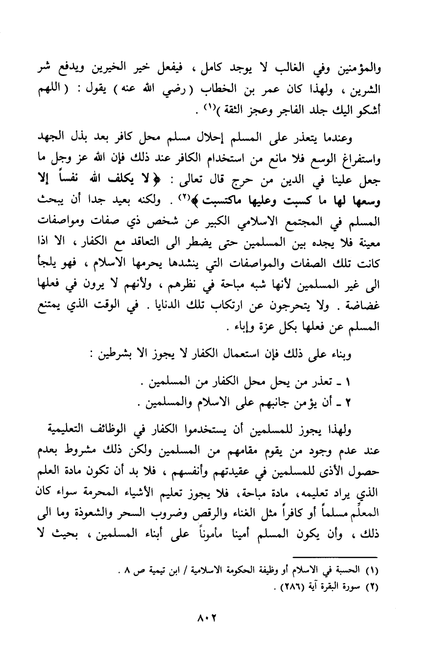 وعندما يتعذر على المسلم إحلال مسلم محل كافر بعد بذل الجهد واستفراغ الوسع فلا مانع من استخدام الكافر عند ذلك فإن الله عز وجل ما جعل علينا في الدين من حرج قال تعالى: (لَا يُكَلِّفُ اللَّهُ نَفْسًا إِلَّا وُسْعَهَا لَهَا مَا كَسَبَتْ وَعَلَيْهَا مَا اكْتَسَبَتْ) (¬2). ولكنه بعيد جدًا أن يبحث المسلم في المجتمع الإسلامي الكبير عن شخص ذي صفات ومواصفات معينة فلا يجده بين المسلمين حتى يضطر إلى التعاقد مع الكفار، إلا إذا كانت تلك الصفات والمواصفات التي ينشدها يحرمها الإسلام، فهو يلجأ إلى غير المسلمين لأنها شبه مباحة في نظرهم، ولأنهم لا يرون في فعلها غضاضة. ولا يتحرجون عن ارتكاب تلك الدنايا. في الوقت الذي يمتنع المسلم عن فعلها بكل عزة وإباء.