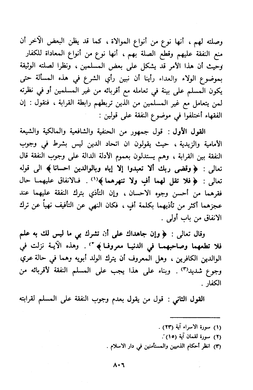 وقال تعالى: (وَإِنْ جَاهَدَاكَ عَلى أَنْ تُشْرِكَ بِي مَا لَيْسَ لَكَ بِهِ عِلْمٌ فَلَا تُطِعْهُمَا وَصَاحِبْهُمَا فِي الدُّنْيَا مَعْرُوفًا) (¬2). وهذه الآية نزلت في الوالدين الكافرين، وهل المعروف أن يترك الولد أبويه وهما في حالة عري وجوع شديد؟ (¬3). وبناء على هذا يجب على المسلم النفقة لأقربائه من الكفار.