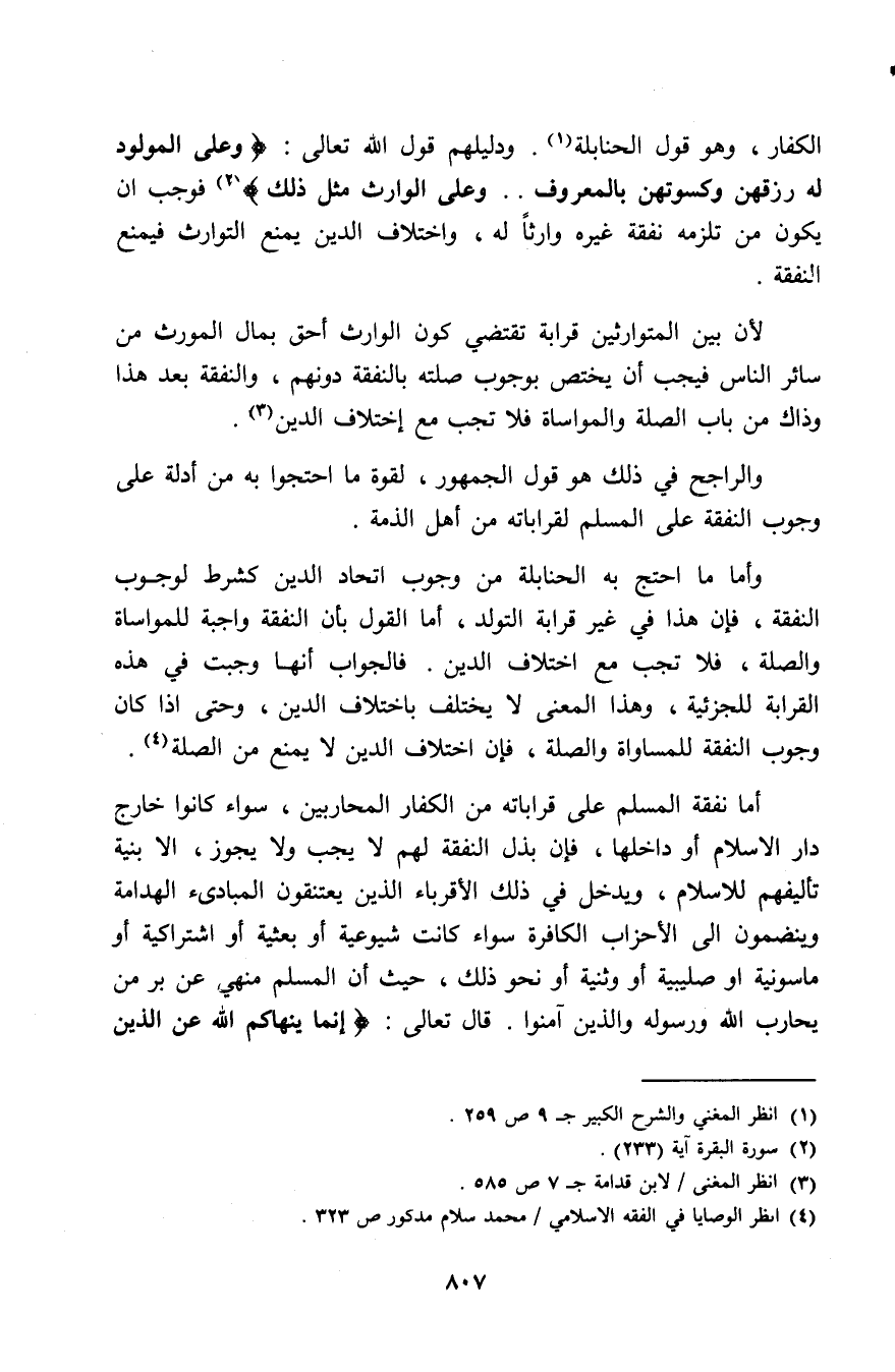 وأما ما احتج به الحنابلة من وجوب اتحاد الدين كشرط لوجوب النفقة، فإن هذا في غير قرابة التولد، اما القول بأن النفقة واجبة للمواساة والصلة، فلا تجب مع اختلاف الدين. فالجواب أنها وجبت في هذه القرابة للجزئية، وهذا المعنى لا يختلف باختلاف الدين، وحتى إذا كان وجوب النفقة للمساواة والصلة، فإن اختلاف الدين لا يمنع من الصلة (¬4).