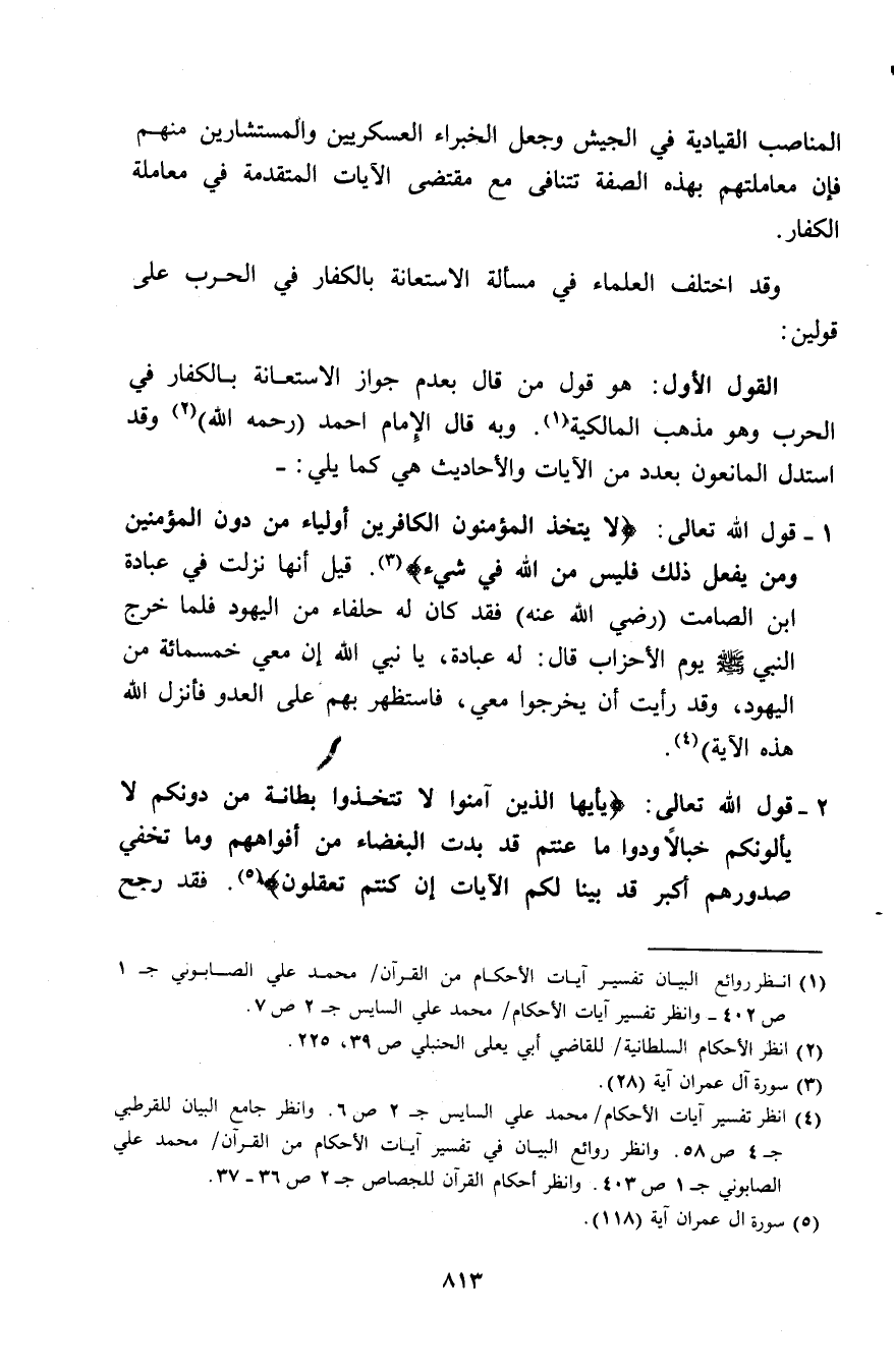 المناصب القيادية في الجيش وجعل الخبراء العسكريين والمستشارين منهم فإن معاملتهم بهذه الصفة تتنافى مع مقتضى الآيات المتقدمة في معاملة الكفار.