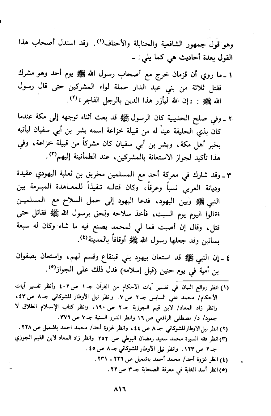4 - إن النبي - صلى الله عليه وسلم - قد استعان بيهود بني قينقاع وقسم لهم، واستعان بصفوان بن أمية في يوم حنين (قبل إسلامه) فدل ذلك على الجواز (¬5).