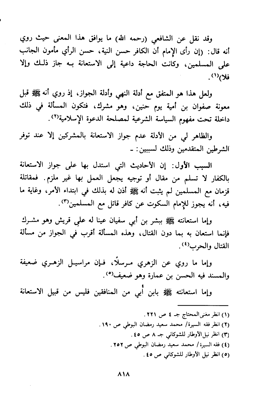 وقد نقل عن الشافعي (رحمه الله) ما يوافق هذا المعنى حيث روي أنه قال: «إن رأى الإمام أن الكافر حسن النية، حسن الرأي مأمون الجانب على المسلمين، وكانت الحاجة داعية إلى الاستعانة به جاز ذلك وإلا فلا» (¬1).